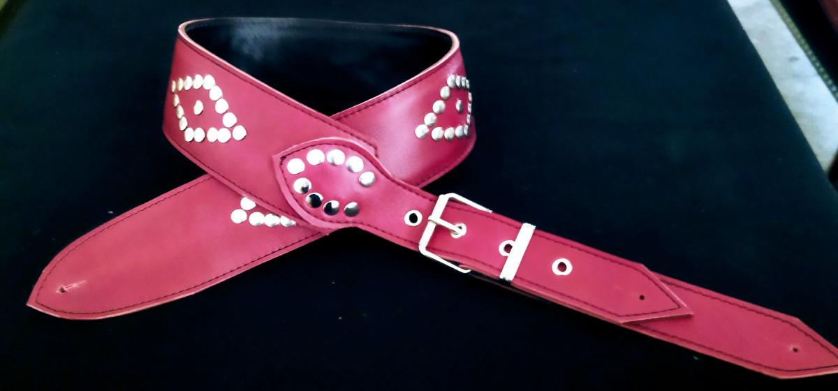 Correa en piel de vaquetilla en rojo burdeos de 7 cm. de ancho de primera calidad, forrada también con piel trabajo muy elaborado. El envío se hace por correo certificado y el pago por Bizum los gastos de envío están incluidos.
