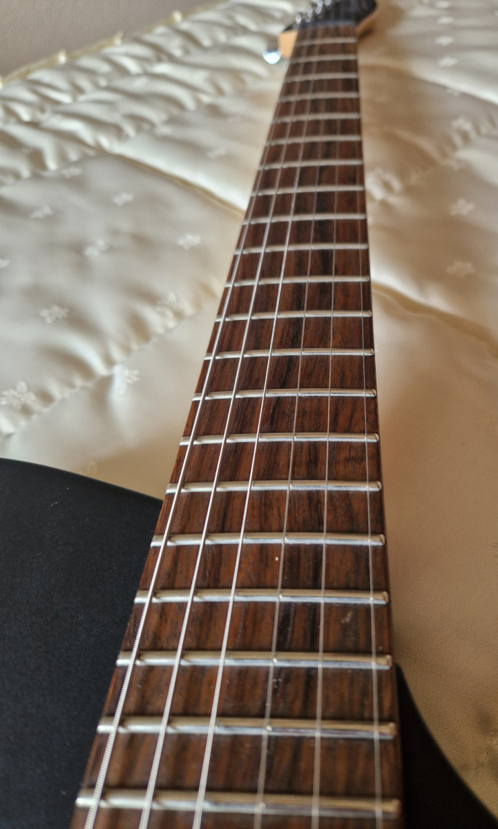 En perfecto estado, prácticamente nueva, trastes al cien por cien, súper cuidada , muy cómoda muy ligera y sonido espectacular.