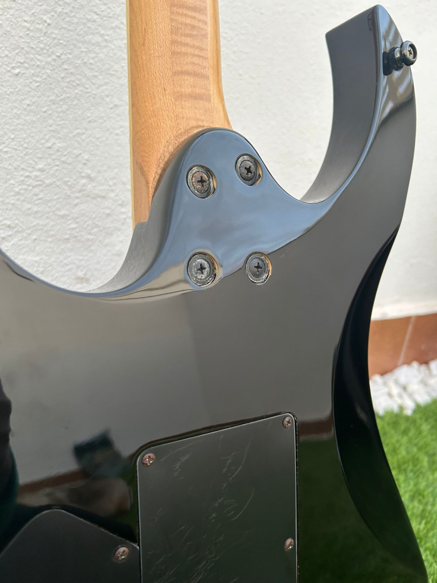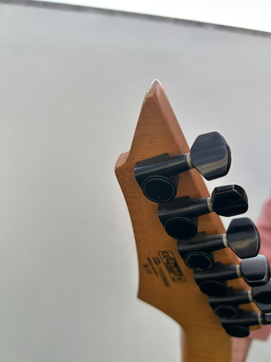 Ajustes: cambio de selletas del puente, bloqueo del Floyd rose con un taco a medida, hidratación del mástil, cambio de cuerdas earnie ball, quintado y octavado en afinación estándar. Todo realizado por el luthier Marco del Pozzo