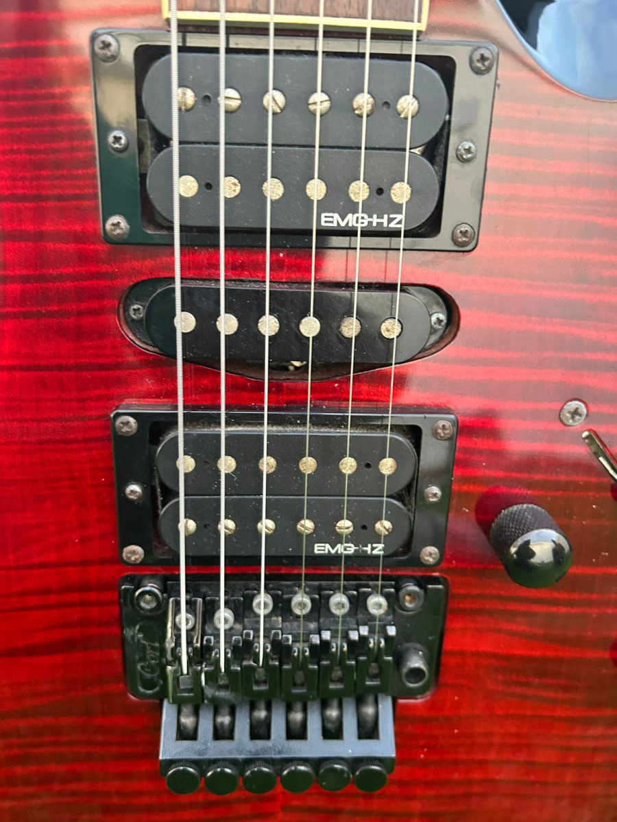 Características: Escala 25’5, 24 trastes jumbo, Pastillas EMG HZ con push-pull, puente tipo Floyd rose.