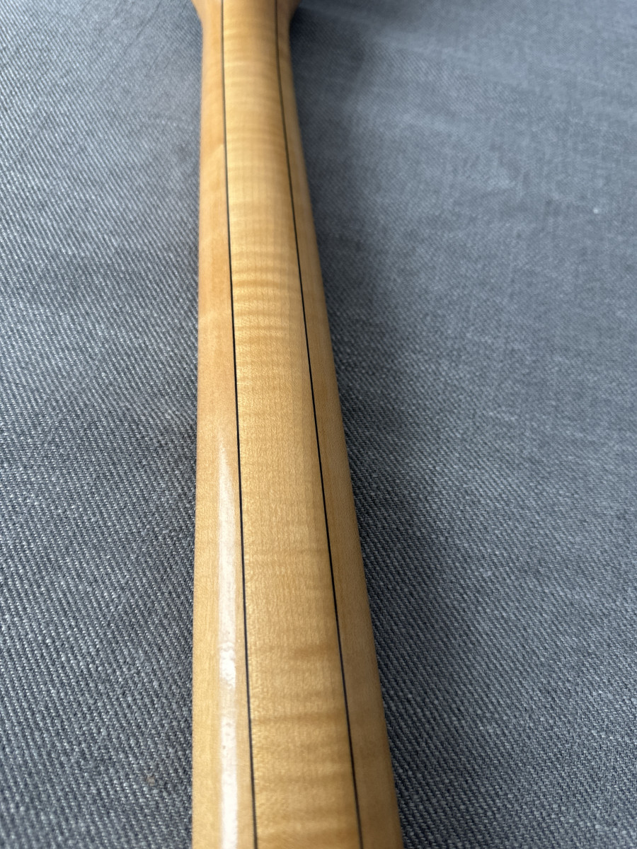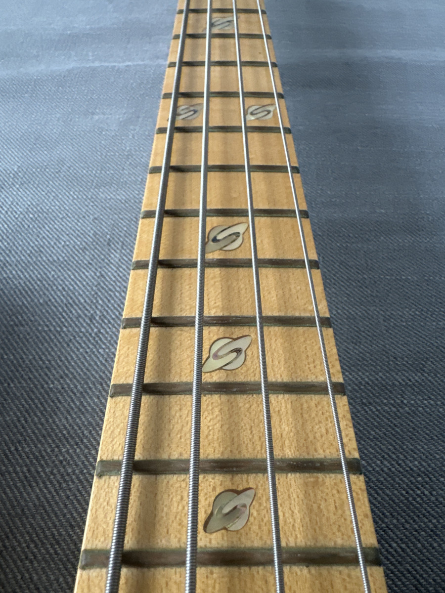 El cuerpo está hecho de fresno de pantano de primera calidad y rematado con una tapa de arce flameado AAAA. Entre el fresno de pantano y el arce flameado hay una chapa multicapa de Ekanga, que le da al bajo una elegante franja de carrera que recorre todo el cuerpo. El mástil está hecho de arce flameado y el diapasón de arce presenta incrustaciones de planetas personalizadas.