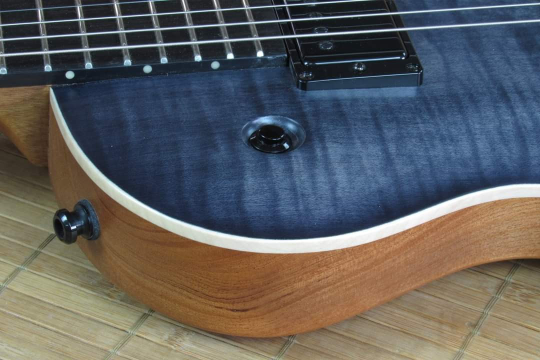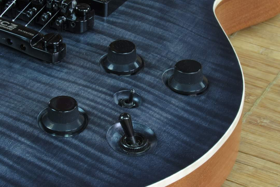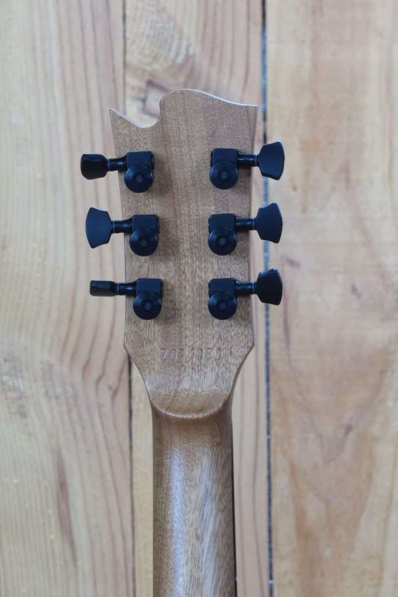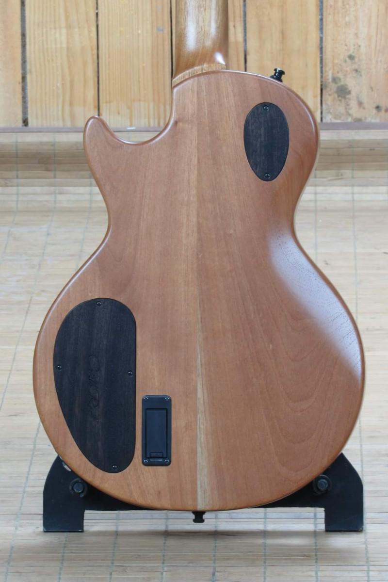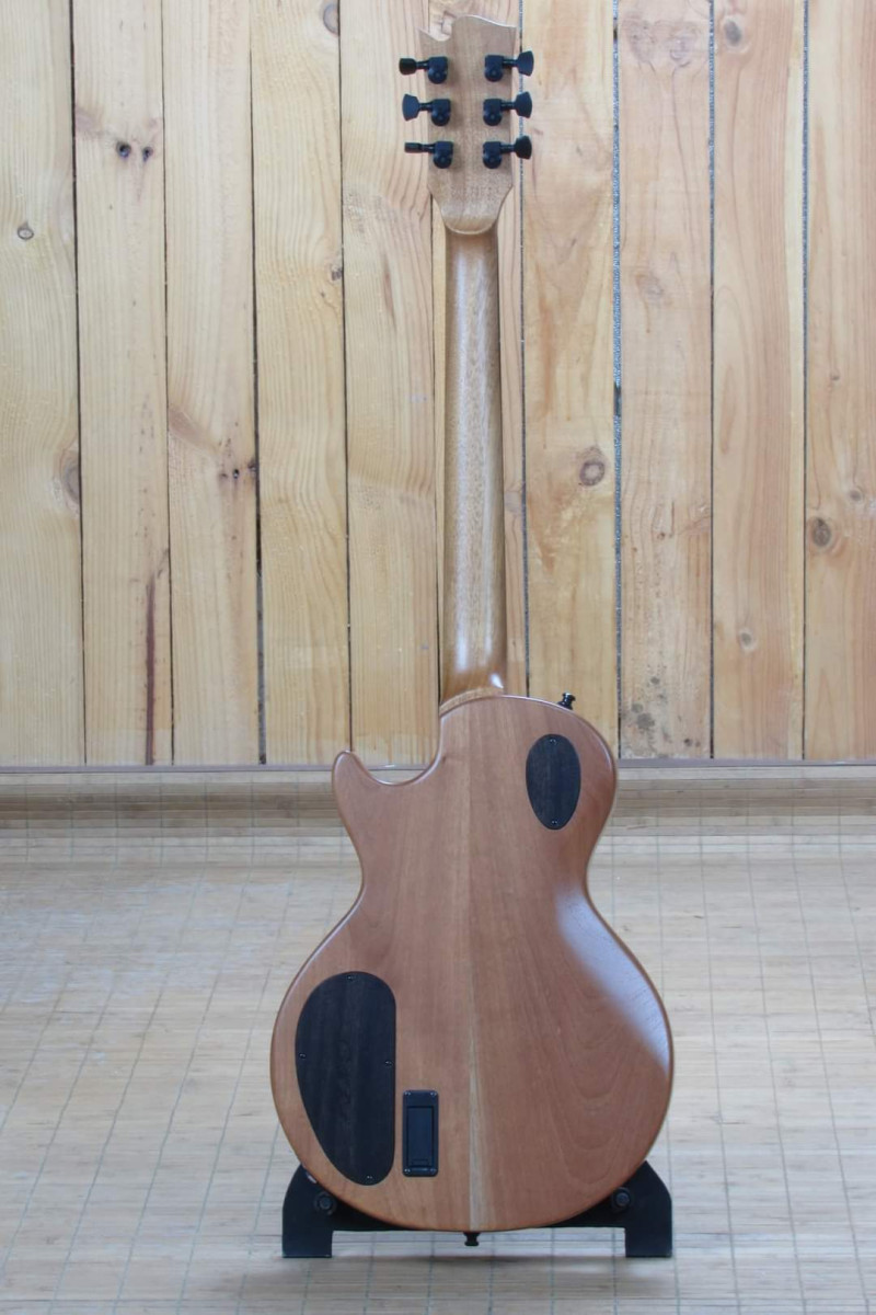 Cuerpo de Cedro, Tapa de Arce Flameado, Mástil de Caoba de 1 pieza con refuerzos de Carbono, Diapasón de Ébano, 22 trastes Dunlop 6100, Puente BABICZ USA Full Contac, Clavijero de bloqueo Sperzel, Pastillas B&B (Pascual Brisa), Potenciometros CTS 1 vol+1 tono+ 1 Gain Booster + micro activador Booster, Kill Switch, Dots laterales Luminiscentes en mástil.