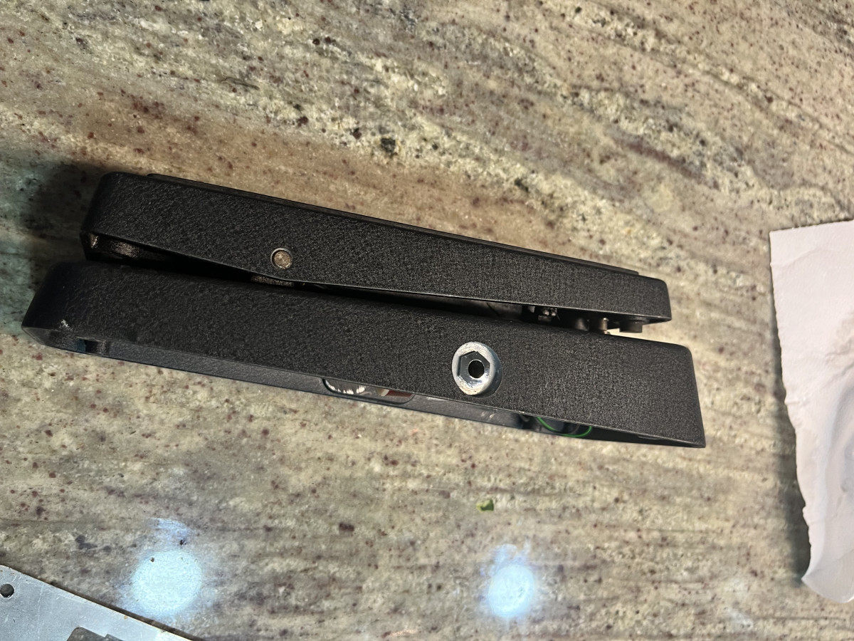 Pedal wah-wah Dunlop Cry Baby modificado y mejorado. Está en buenas condiciones, aunque presenta señales de uso en la base.