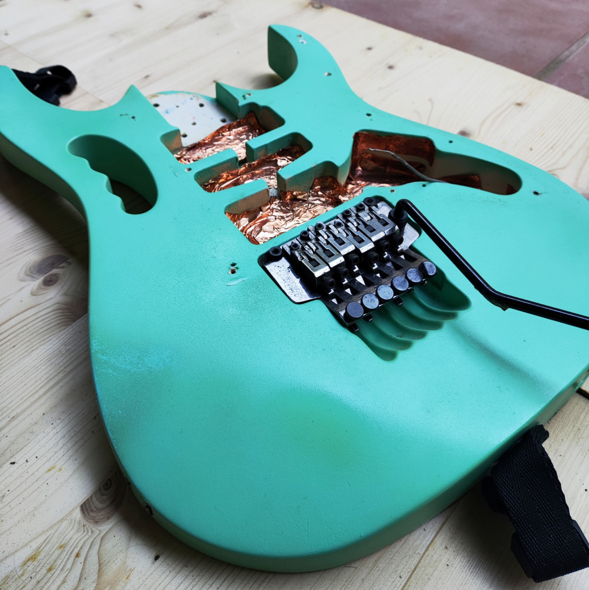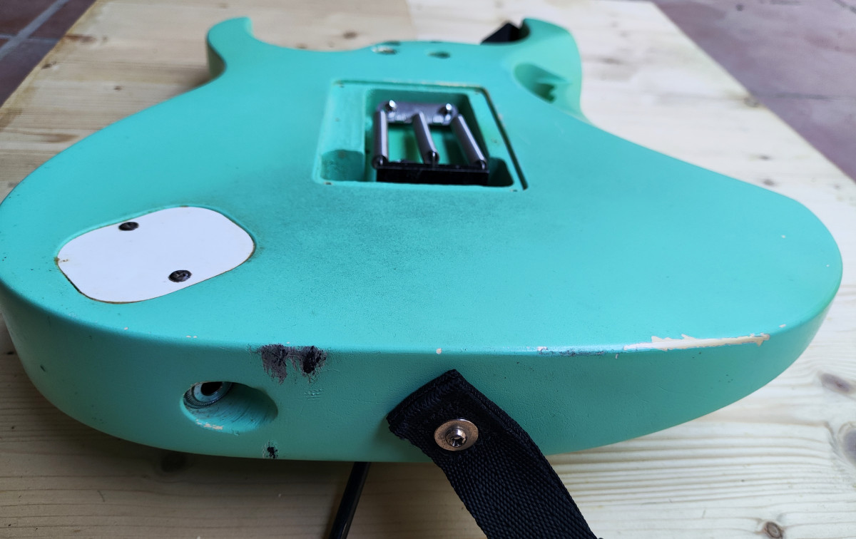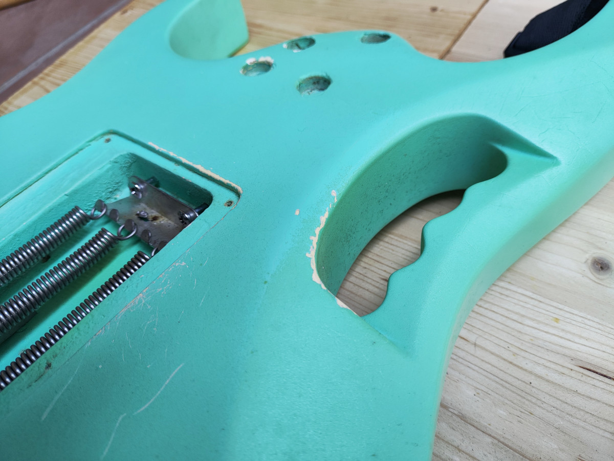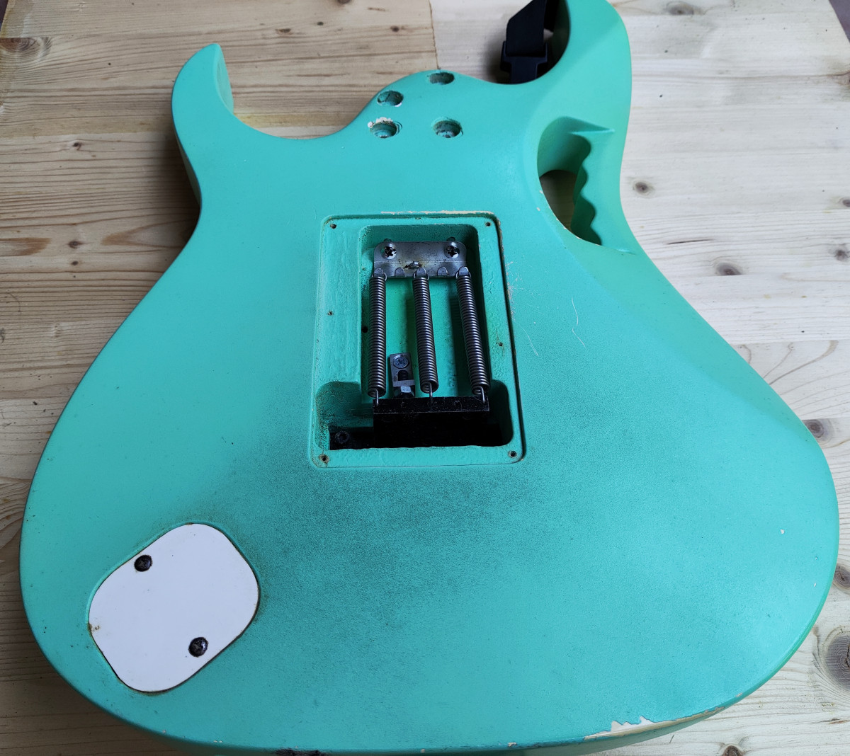 Vendo este cuerpo de tilo procedente de una de las primeras Ibanez Jem 555 que se fabricaron en el año 1995. Originalmente era blanco pero hace unos años se pintó en Sea Foam Green con pintura de nitrocelulosa (no profesionalmente). Está pintura está empezando a envejecer, hay partes donde se empieza a agrietar y ponerse amarillenta. Está apantallado con cobre e incluyo el Jack y el tremolo que es un Ibanez Lo Trs II.