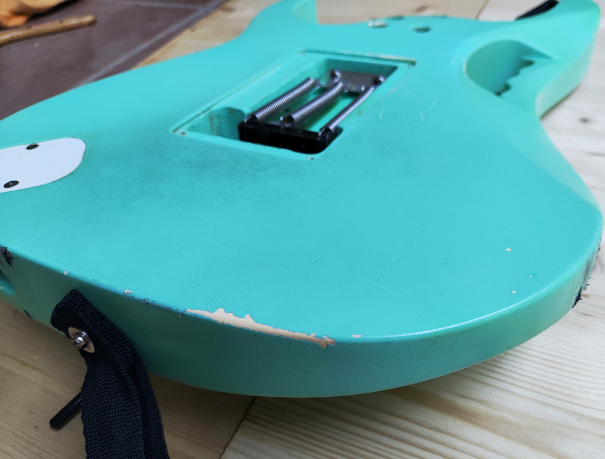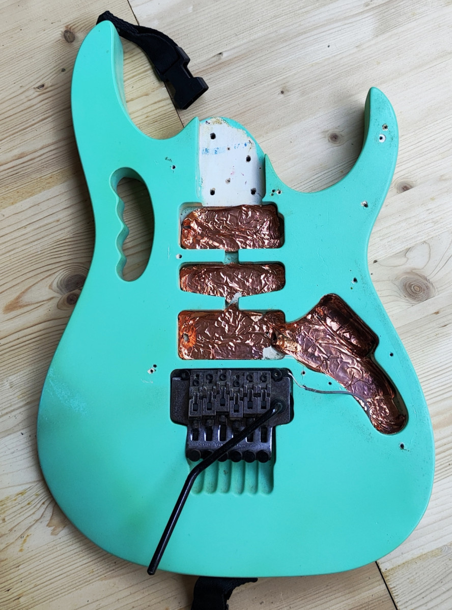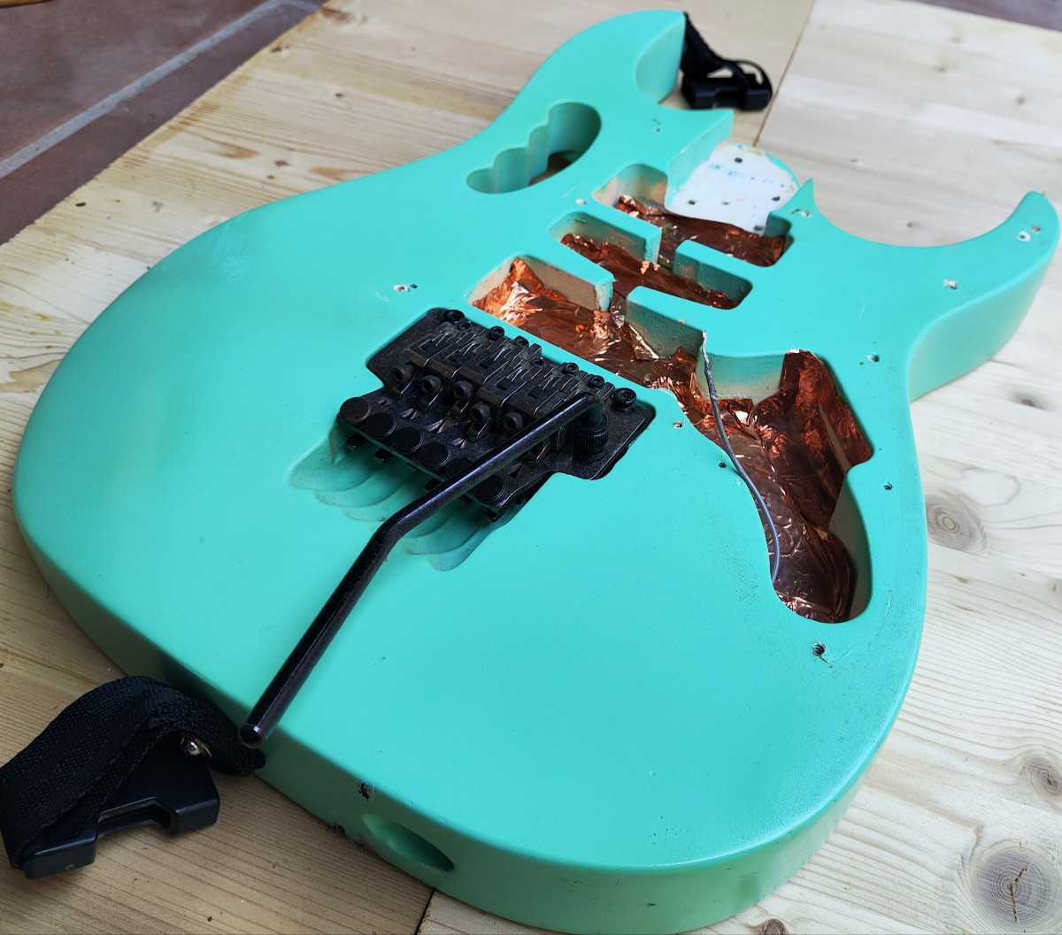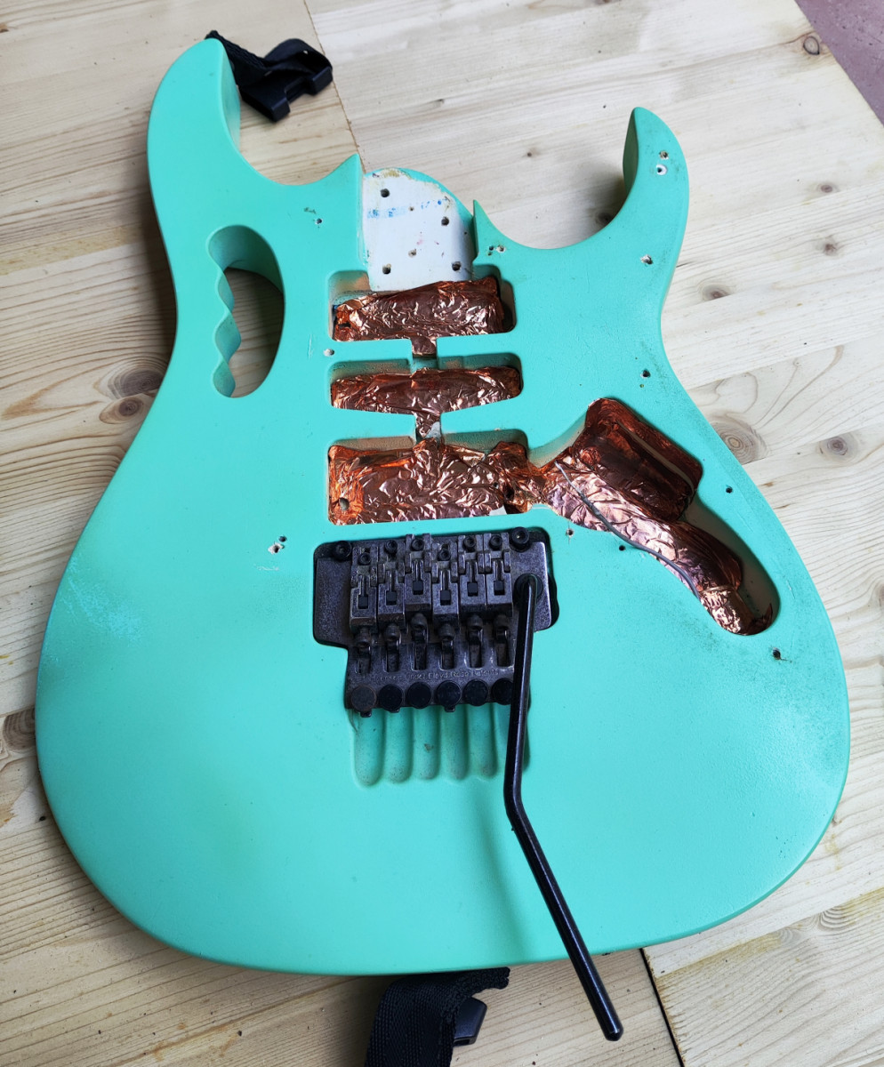 Vendo este cuerpo de tilo procedente de una de las primeras Ibanez Jem 555 que se fabricaron en el año 1995. Originalmente era blanco pero hace unos años se pintó en Sea Foam Green con pintura de nitrocelulosa (no profesionalmente). Está pintura está empezando a envejecer, hay partes donde se empieza a agrietar y ponerse amarillenta. Está apantallado con cobre e incluyo el Jack y el tremolo que es un Ibanez Lo Trs II.