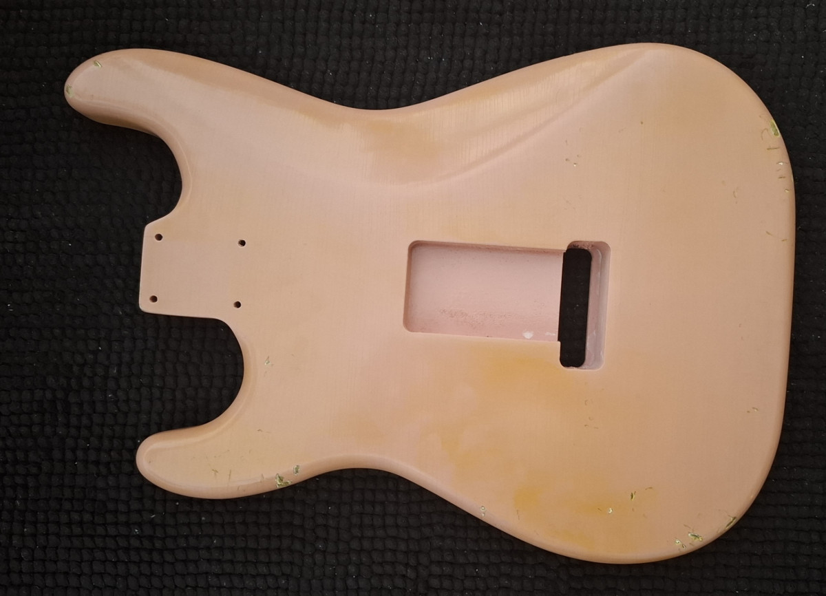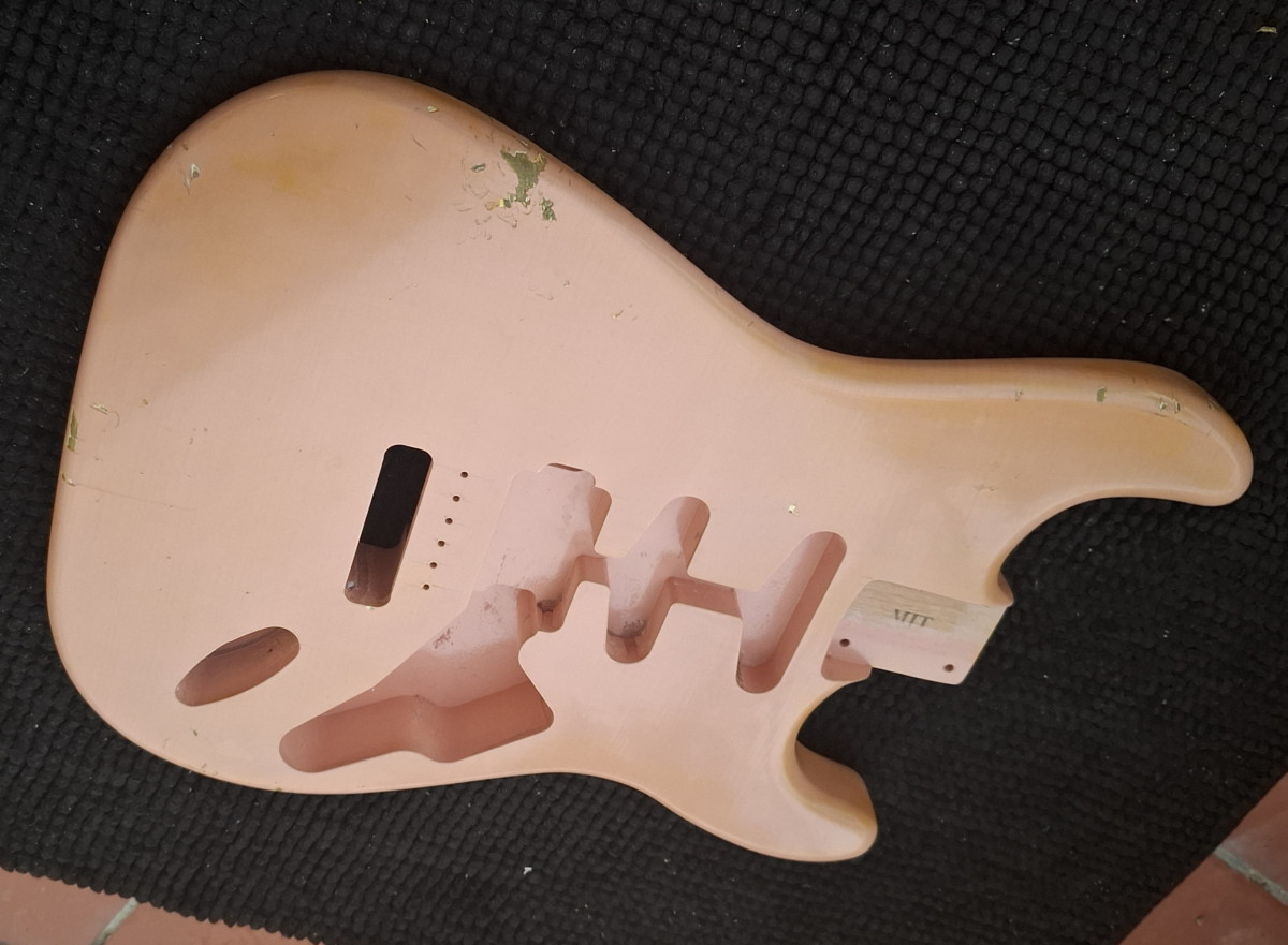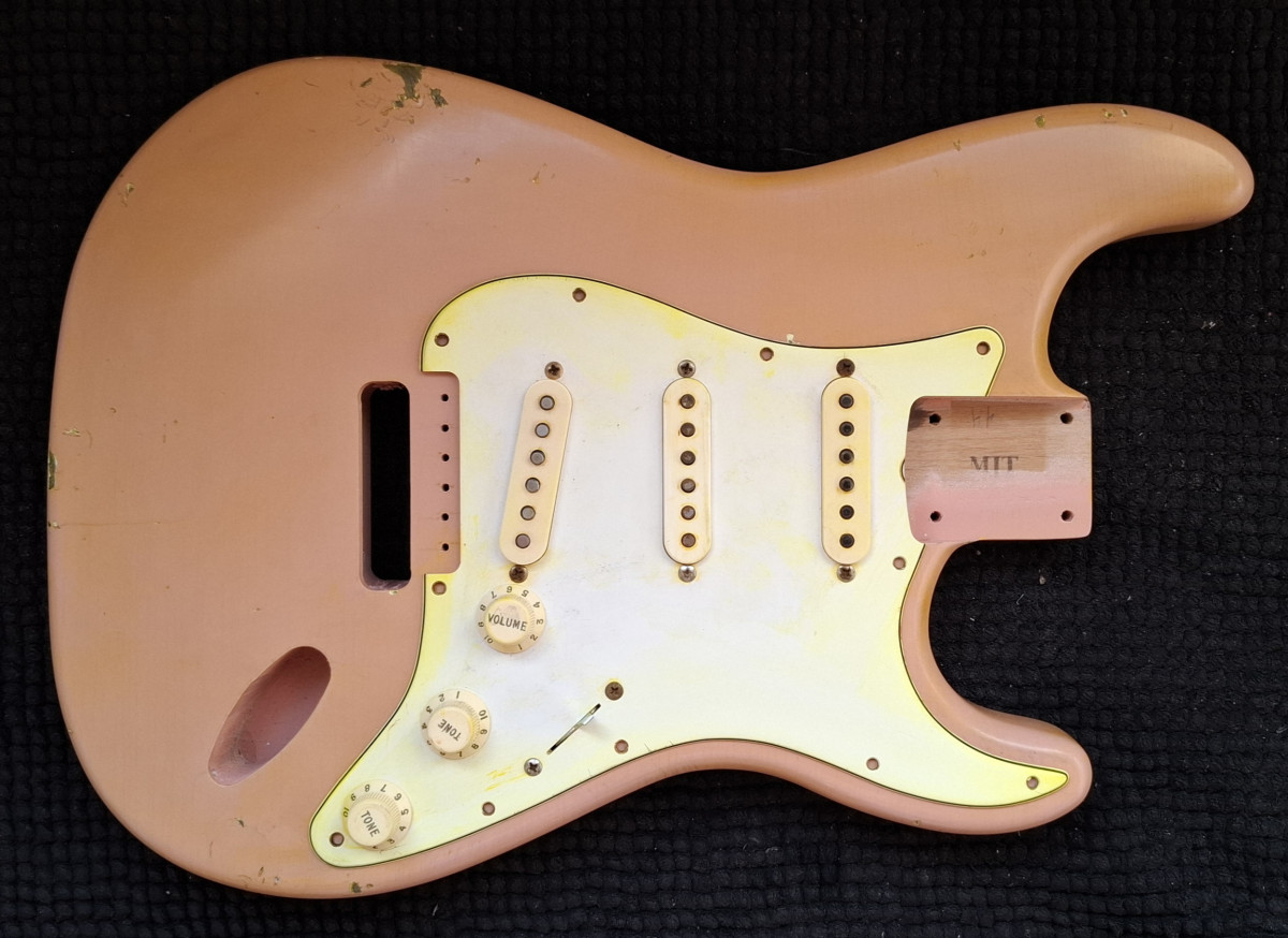 Cuerpo Stratocaster MJT con acabado Aged Pink y configuración Hss. Alder y barniz nitro crakelado!!! Relic. Peso 1.95kg. Pickguard no incluido.