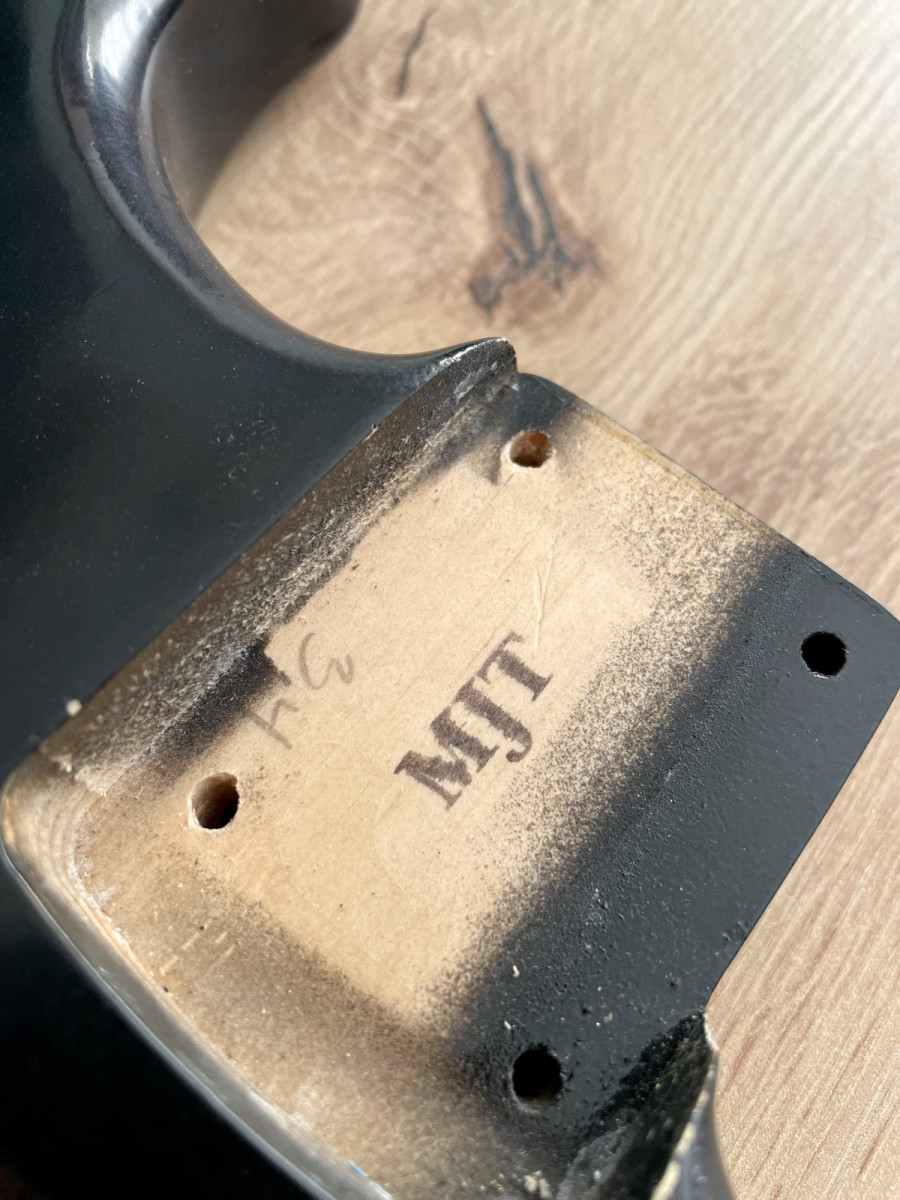 Cuerpo de guitarra MJT estilo Stratocaster en color negro pintado por Mark Jenny en Estados Unidos. 100% Nitrocelulosa. ¡SOLO 1,54 Kg!