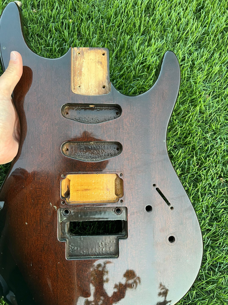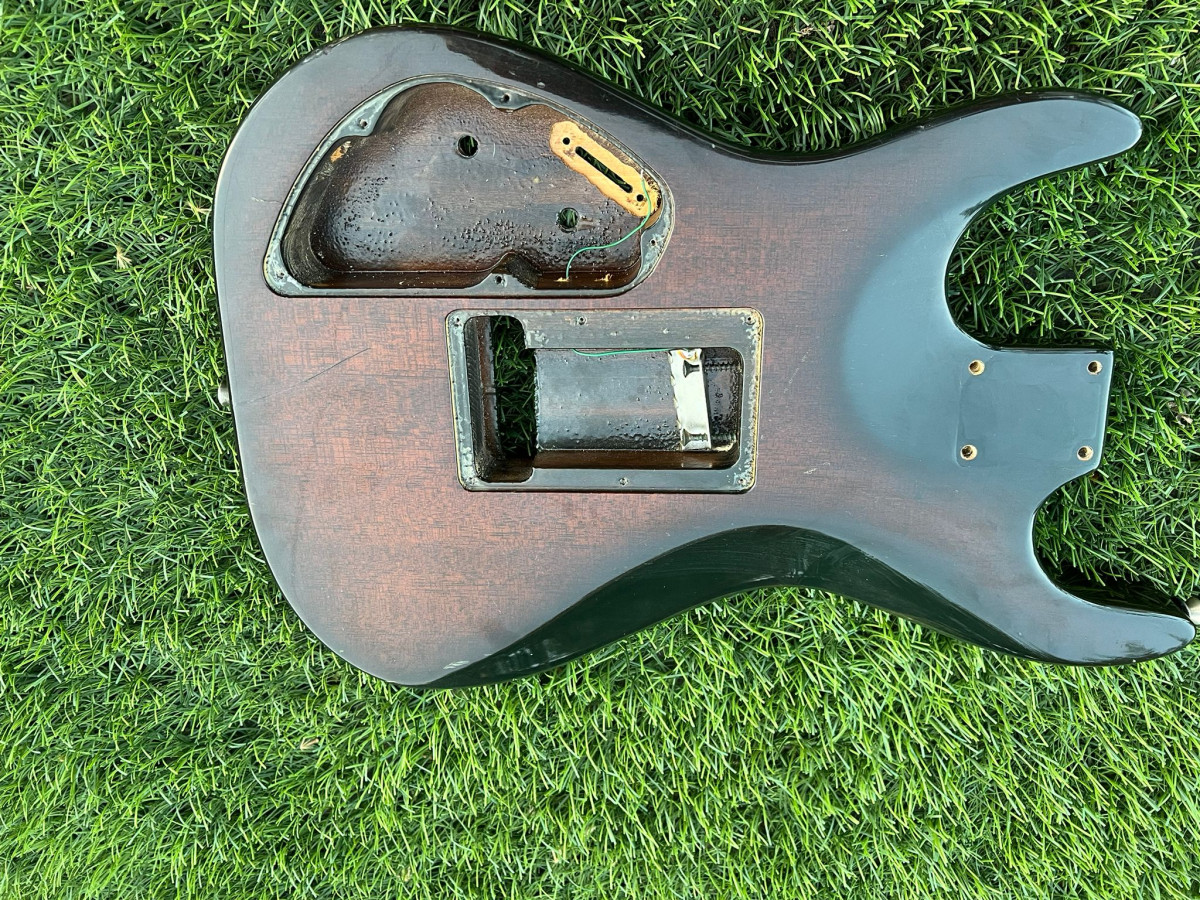 Cuerpo de una shadow s100 alemana. Es de tilo, peso 1,95kg. Tiene marcas de uso como se puede ver, pero nada que afecte a su funcionalidad. Se entrega con las tapas del floyd rose y de la electronica, no mostradas en la imagen.