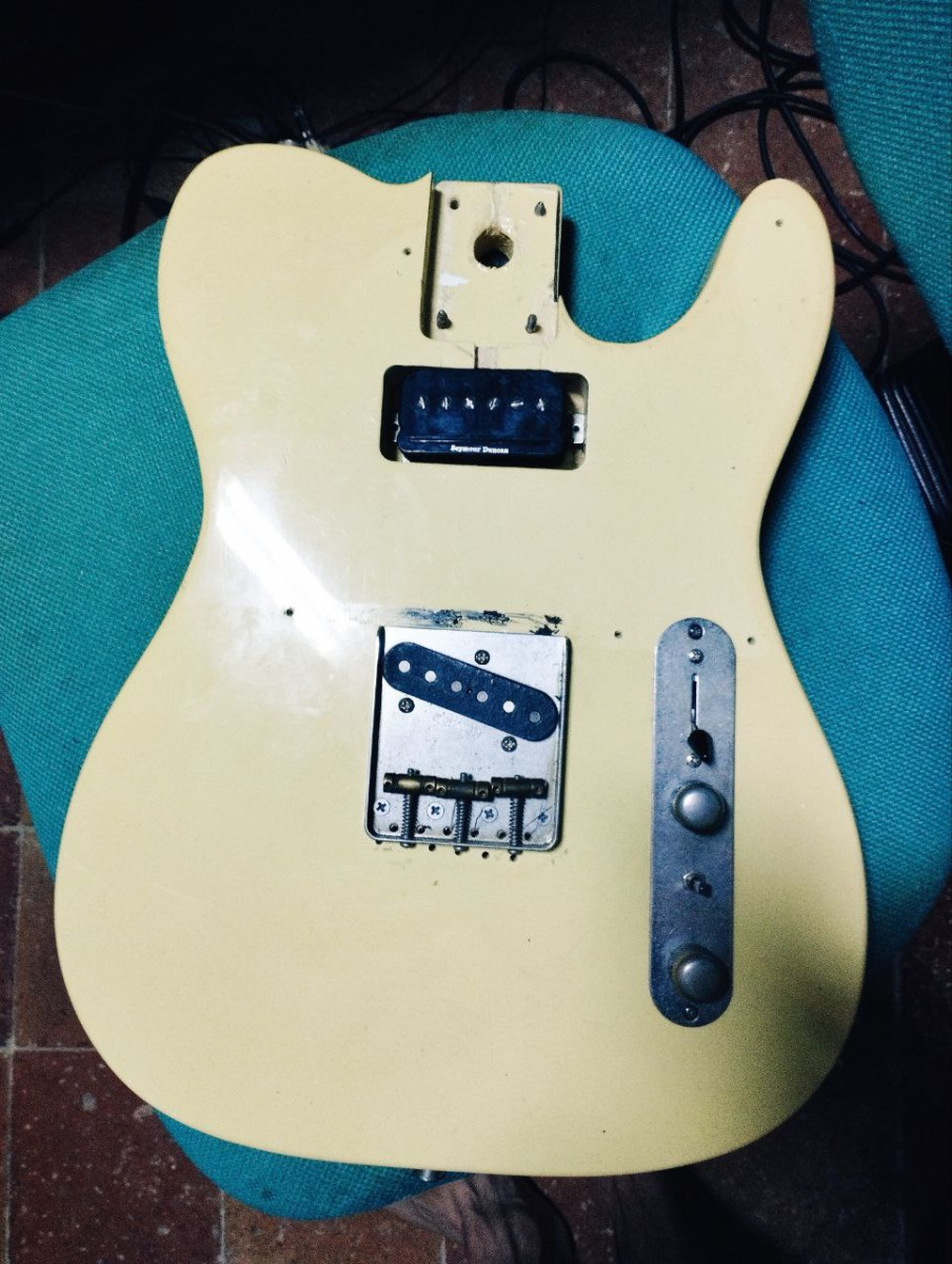 Vendo este cuerpo de Telecaster Canadiense comprado en Ebay, con pastillas y potes top. El puente, potes y pastilla de agudos es de una telecaster americana. La pastilla del mástil es una seymour duncan trembucker (hotrail+p90+juntas) cableadas para que suenen más jazzy a lo "paf", tiene montado el cambio de fase tb, con lo que tiene mil combinaciones de sonido. El luthier que la montó tuvo que subir un poco la altura del mástil respecto al agujero para que no trasteara, y sin problemas. Tiene los agujeros detrás del puente anterior.