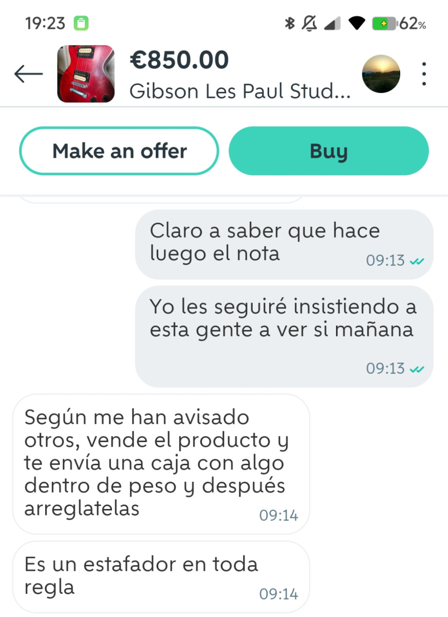 Parece ser que hay un hijo de fruta robando el anuncio y la descripción de anuncios de guitarras. Te lo puede sacar de cualquier plataforma donde tengas publicado el anuncio y lo sube a su cuenta con un precio bastante menor y espera a que pique. Cuando alguien cae si es que es un envío le manda una caja vacía con peso dentro y le hace la bola para que le dé al okey antes de abrir el producto.