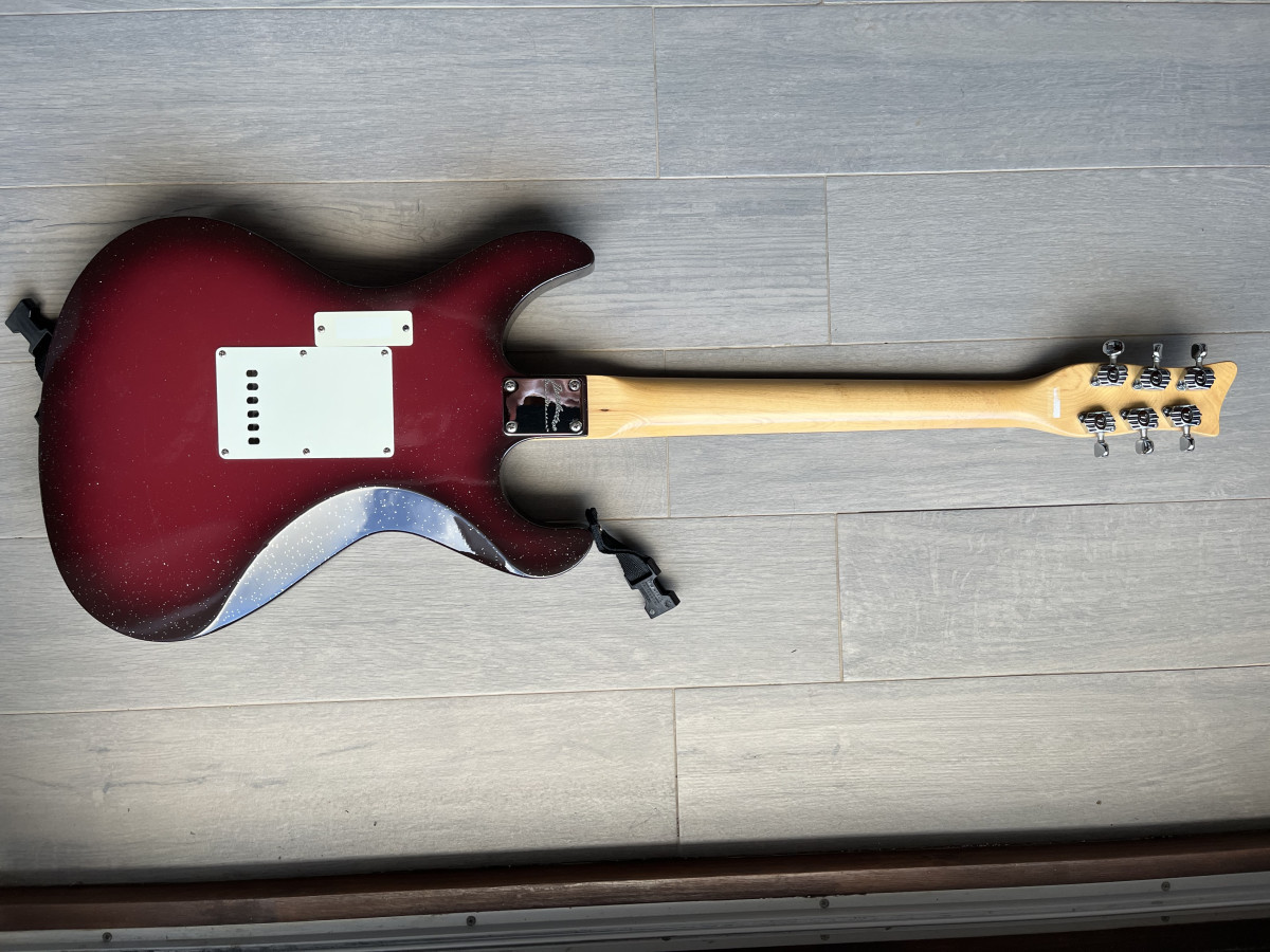 La guitarra suena muy bien y es cómoda de tocar, es un cruce entre una mosrite y una estratocaster.