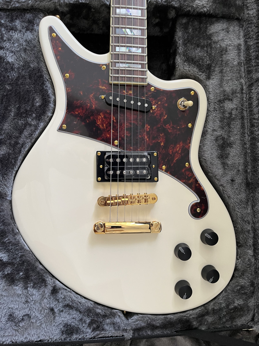 Guitarra eléctrica D'Angelico Deluxe Bedford Vintage White, NUEVA SIN ESTRENAR. Cuerpo de tilo, perfil offset "retro", mástil arce/nogal/arce (perfil C), diapasón pau ferro, escala 24.75", 22 trastes. Pastillas Seymour Duncan: STK (mástil), DA-59 (puente). Push/pull para coil split. Puente Tune-O-Matic + Stopbar. Clavijas Grover Locking doradas. Acabado blanco vintage, hardware dorado. Incluye funda rígida original. Se puede probar en Manresa, Barcelona y Mallorca.