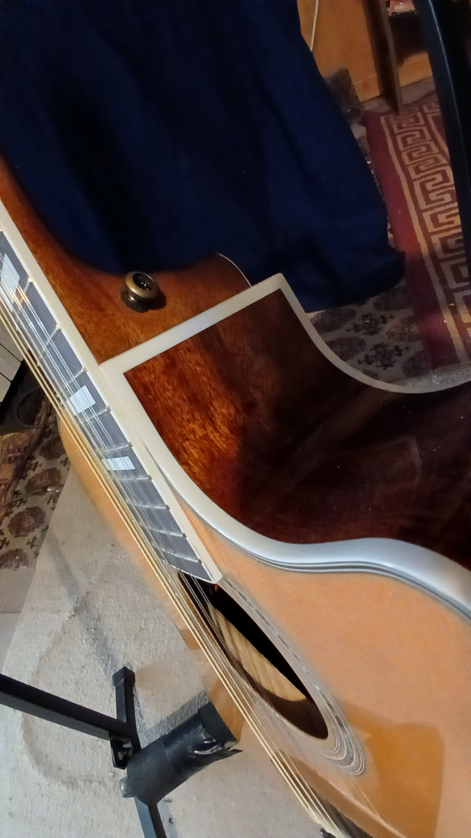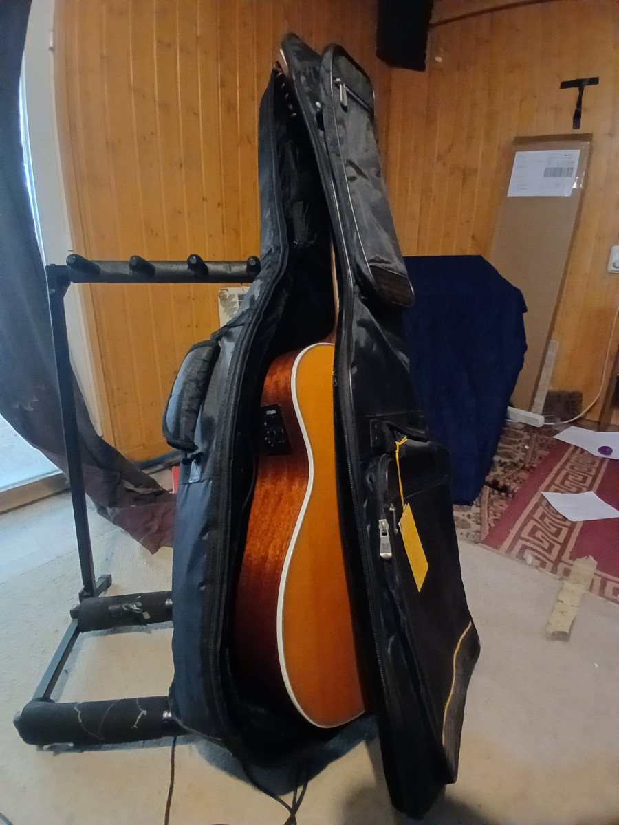 La guitarra está en perfecto estado, la cambié este verano, porquenibamos a montar un repertorio acustico en el grupo, pero... el grupo saltó por los aires y como digo en el anuncio de venta de todo el equipo, todo se ha juntado y me veo obligado a venderlo (casi) todo. Sólo tocada (y poco) en casa, sin bolos.