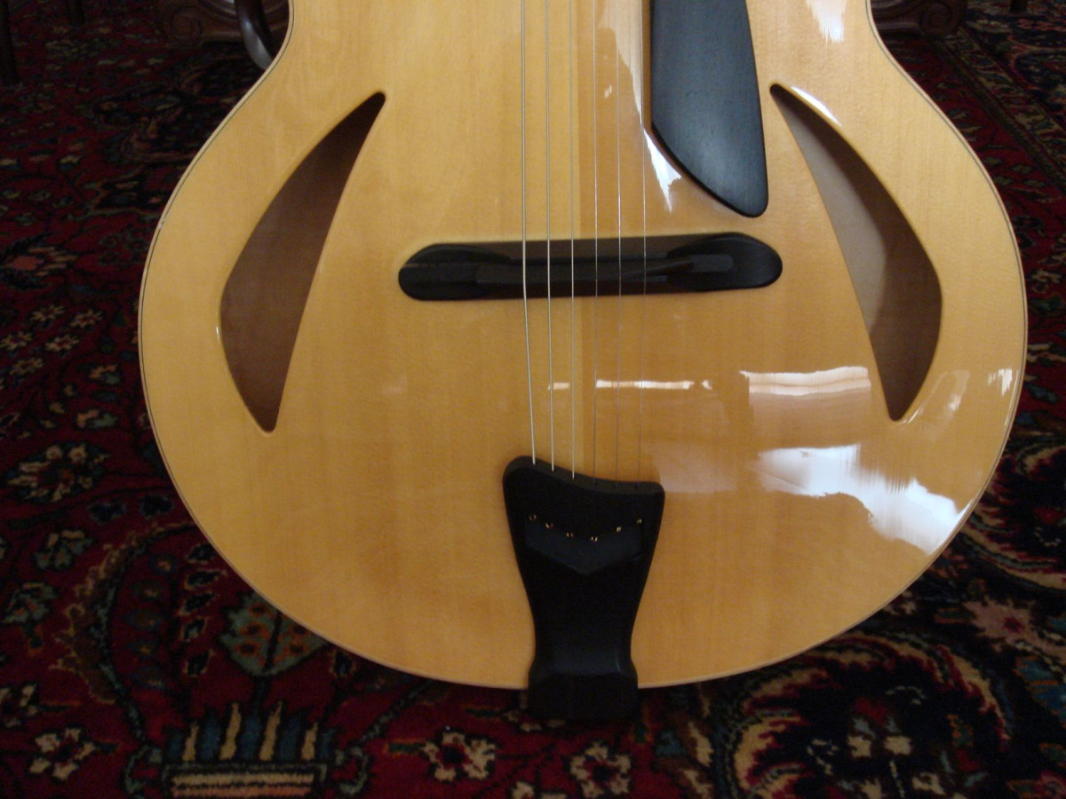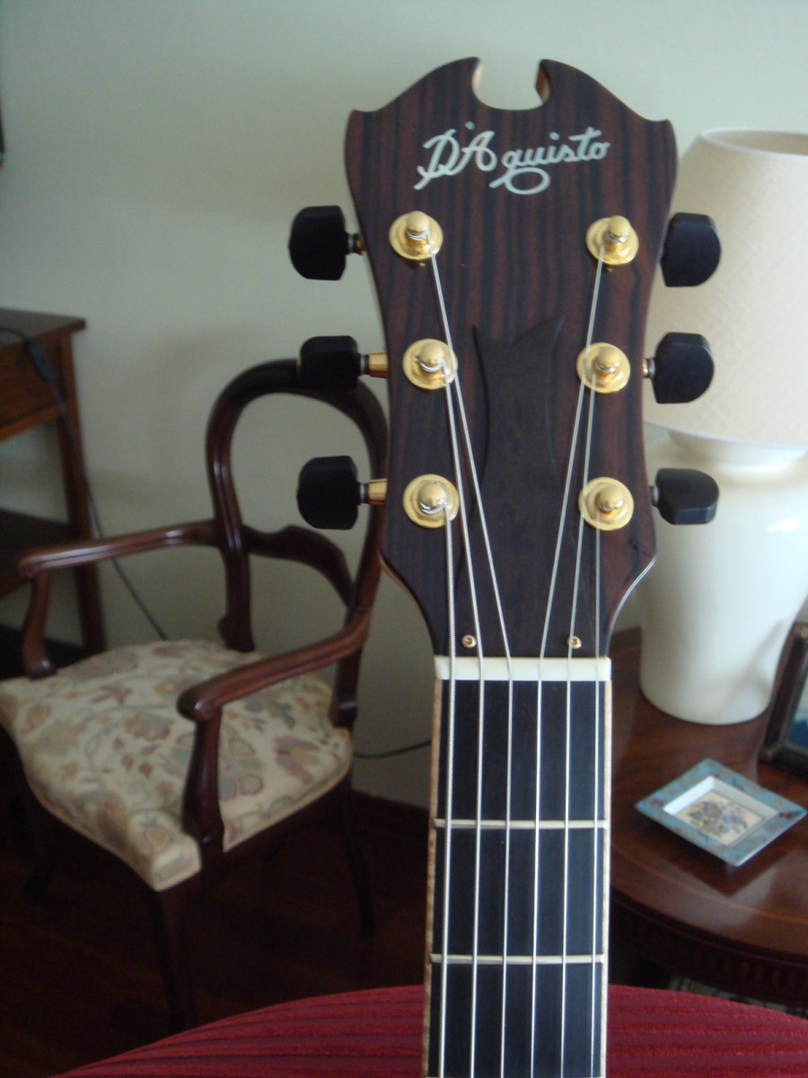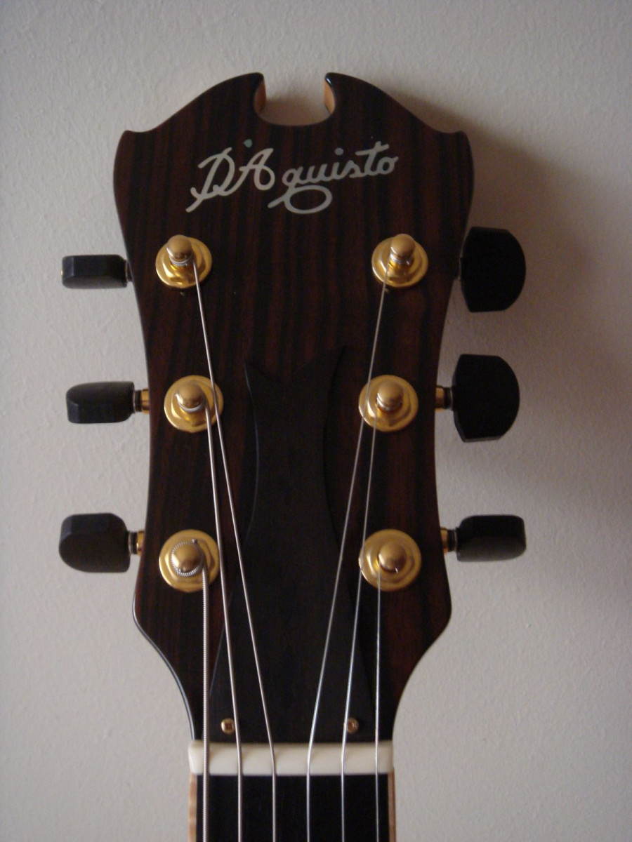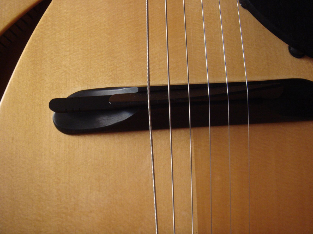 Siguiendo la filosofía de D’Aquisto, casi todas las piezas son de ébano : puente, cordal, golpeador, clavijas de los afinadores. El puente es el modelo usado por D’Aquisto llamado Acutone. Esta hecho de ébano y consiste en dos cuñas. Muy fácil de usar.