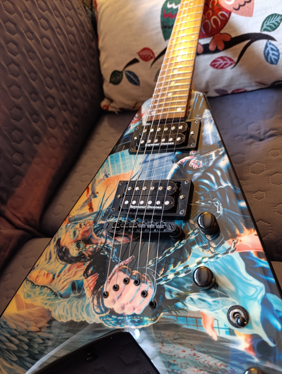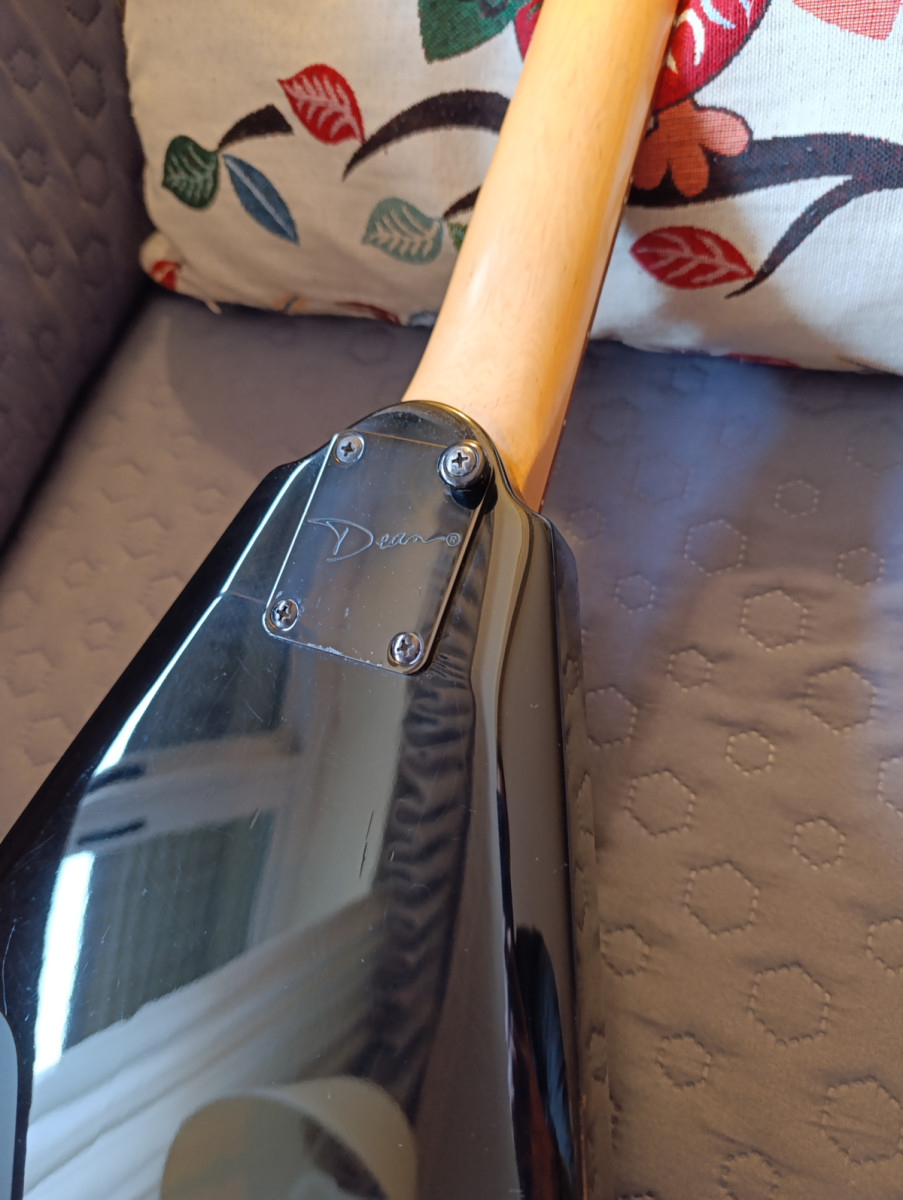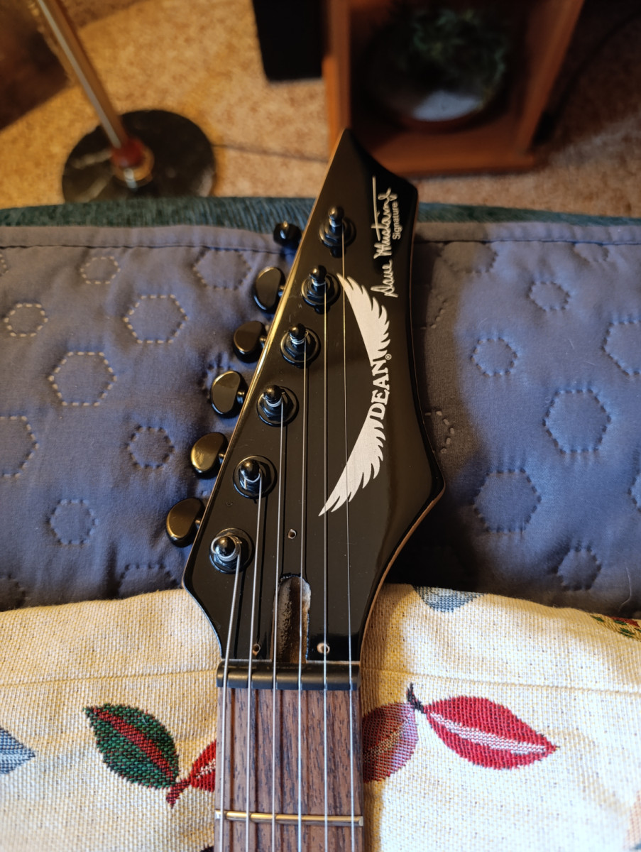 Saco para cambio mi Dean Dave Mustaine, Unite Abominations Lleva la electrónica recién hecha , ajustada, trastes nivelados, con algunos extras y pastillas Seymour Duncan sh6 , esta es la versión que venia con afinadores grover que está descatalogada desde hace bastantes años, guitarra muy rara de ver y muy bien construida, cuerpo de Tilo, mástil de Arce en D ultrarápido, y diapasón de Jatoba.