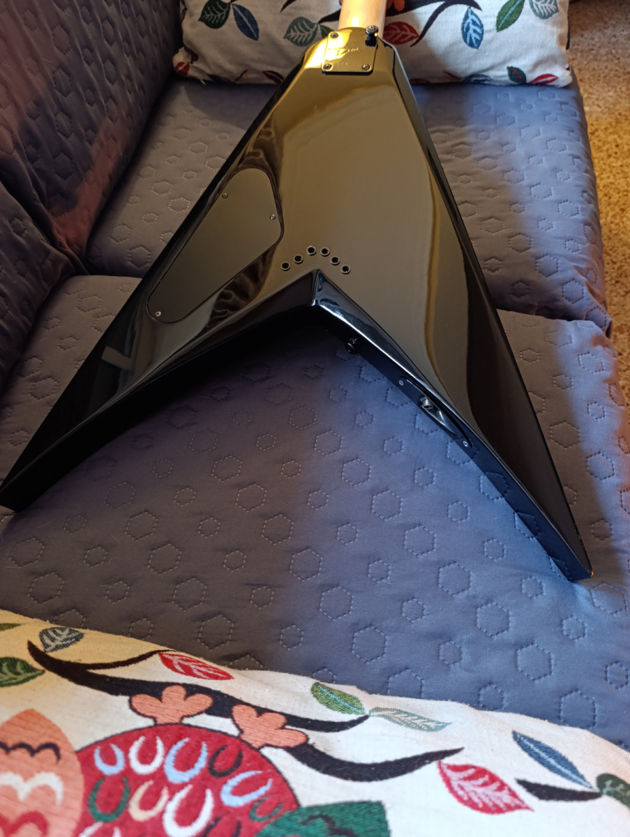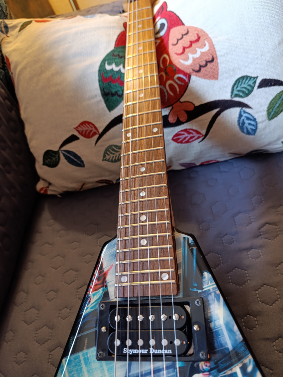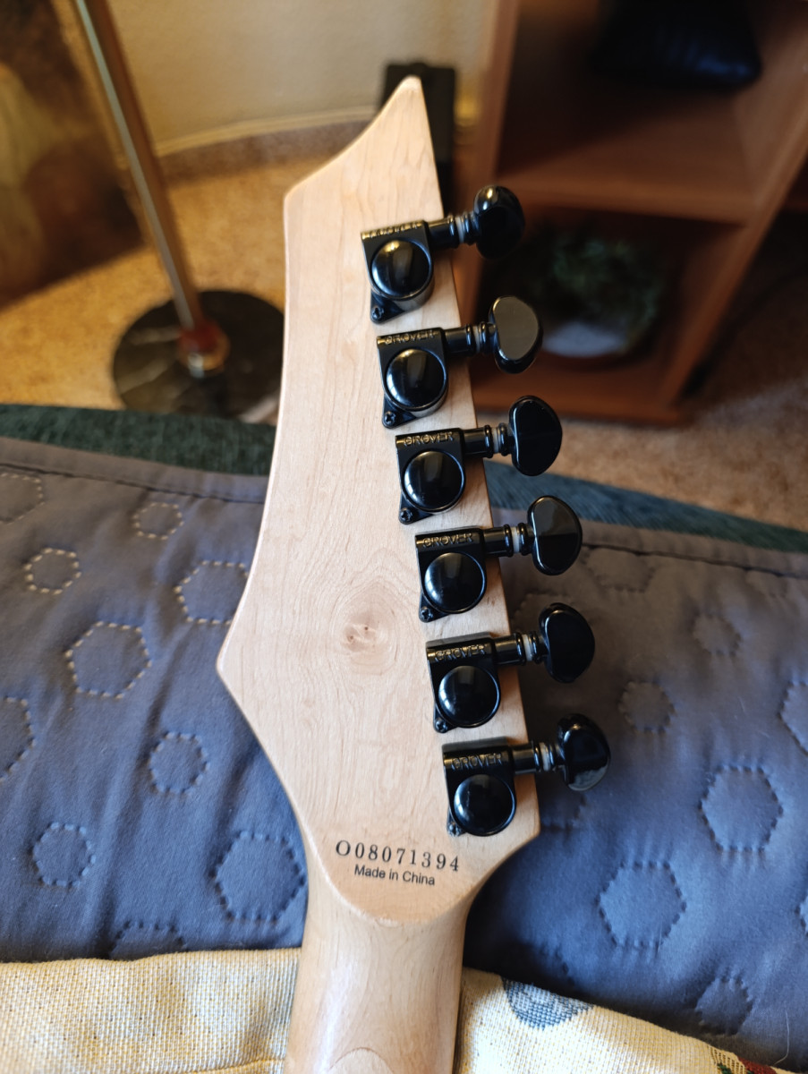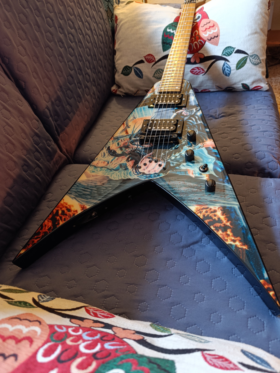 Saco para cambio mi Dean Dave Mustaine, Unite Abominations Lleva la electrónica recién hecha , ajustada, trastes nivelados, con algunos extras y pastillas Seymour Duncan sh6 , esta es la versión que venia con afinadores grover que está descatalogada desde hace bastantes años, guitarra muy rara de ver y muy bien construida, cuerpo de Tilo, mástil de Arce en D ultrarápido, y diapasón de Jatoba.