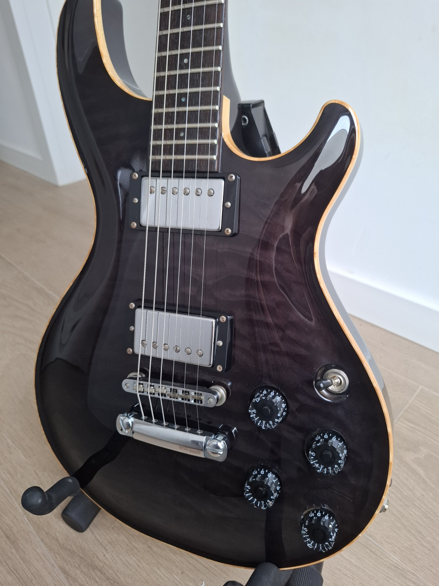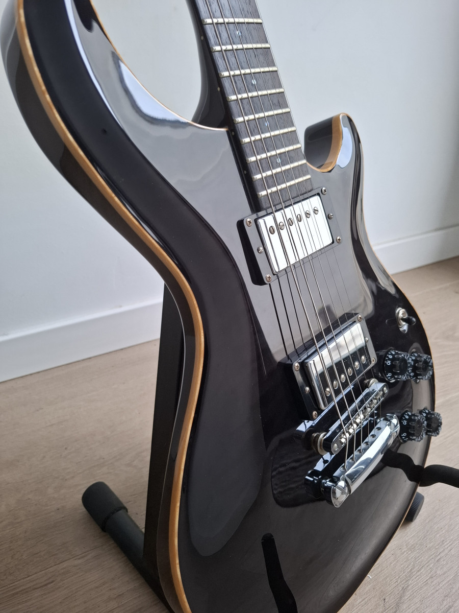Es de caoba maciza, negra con tapa de arce negra translúcida, está 10/10, pasada por Luthier hace 1 mes.