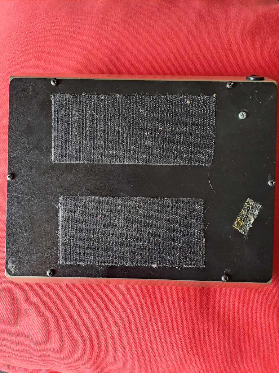 Tiene velcro en la parte inferior y algo de pegamento de cinta de carrocero en el frontal (que no he querido limpiar, aunque sería sencillo).