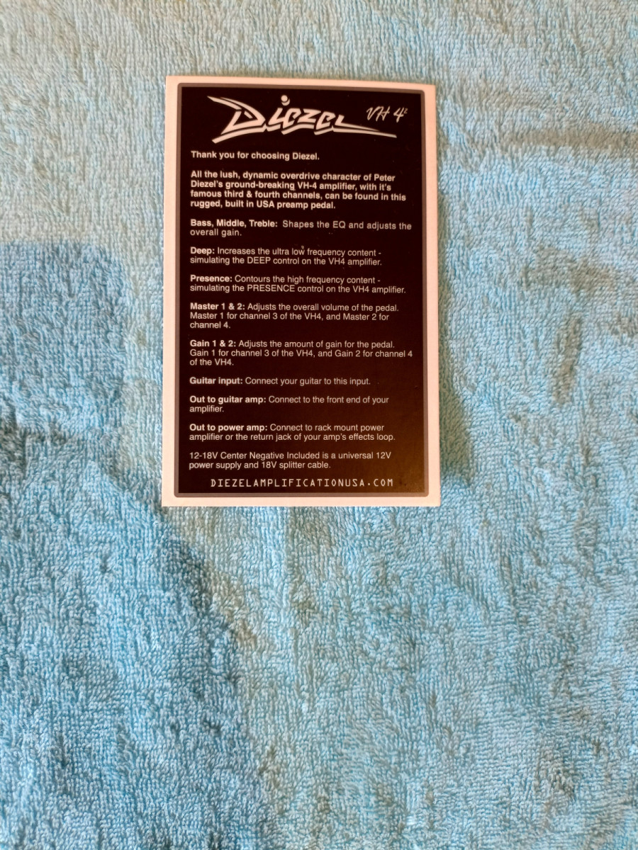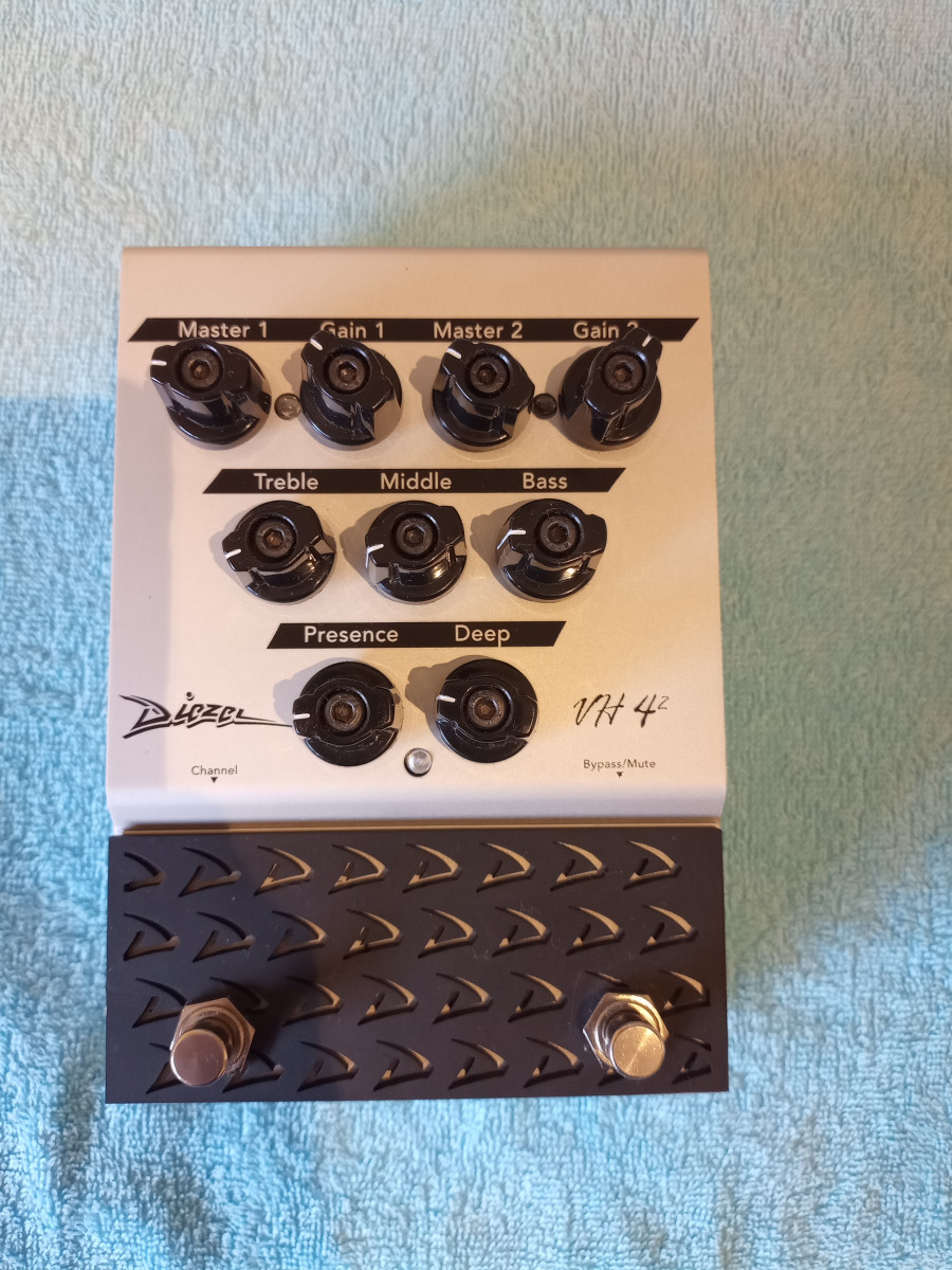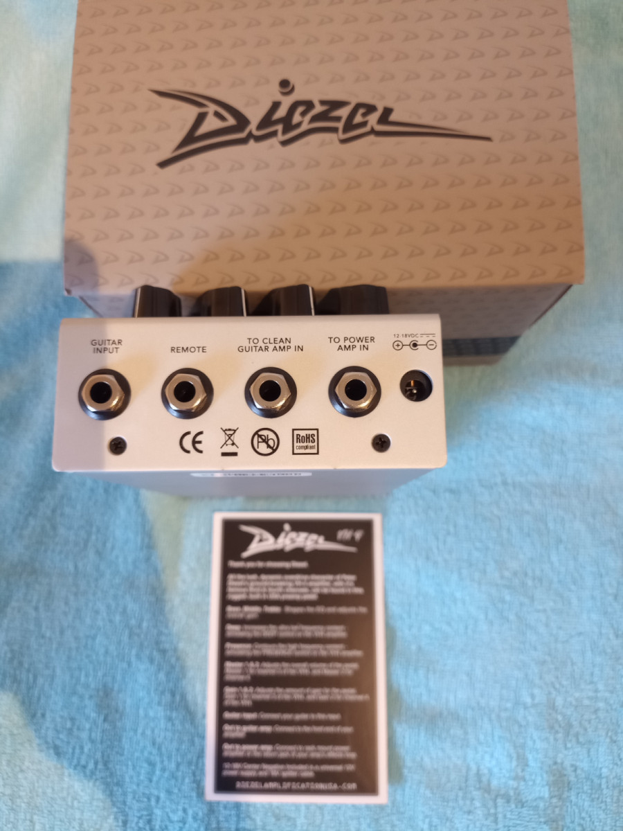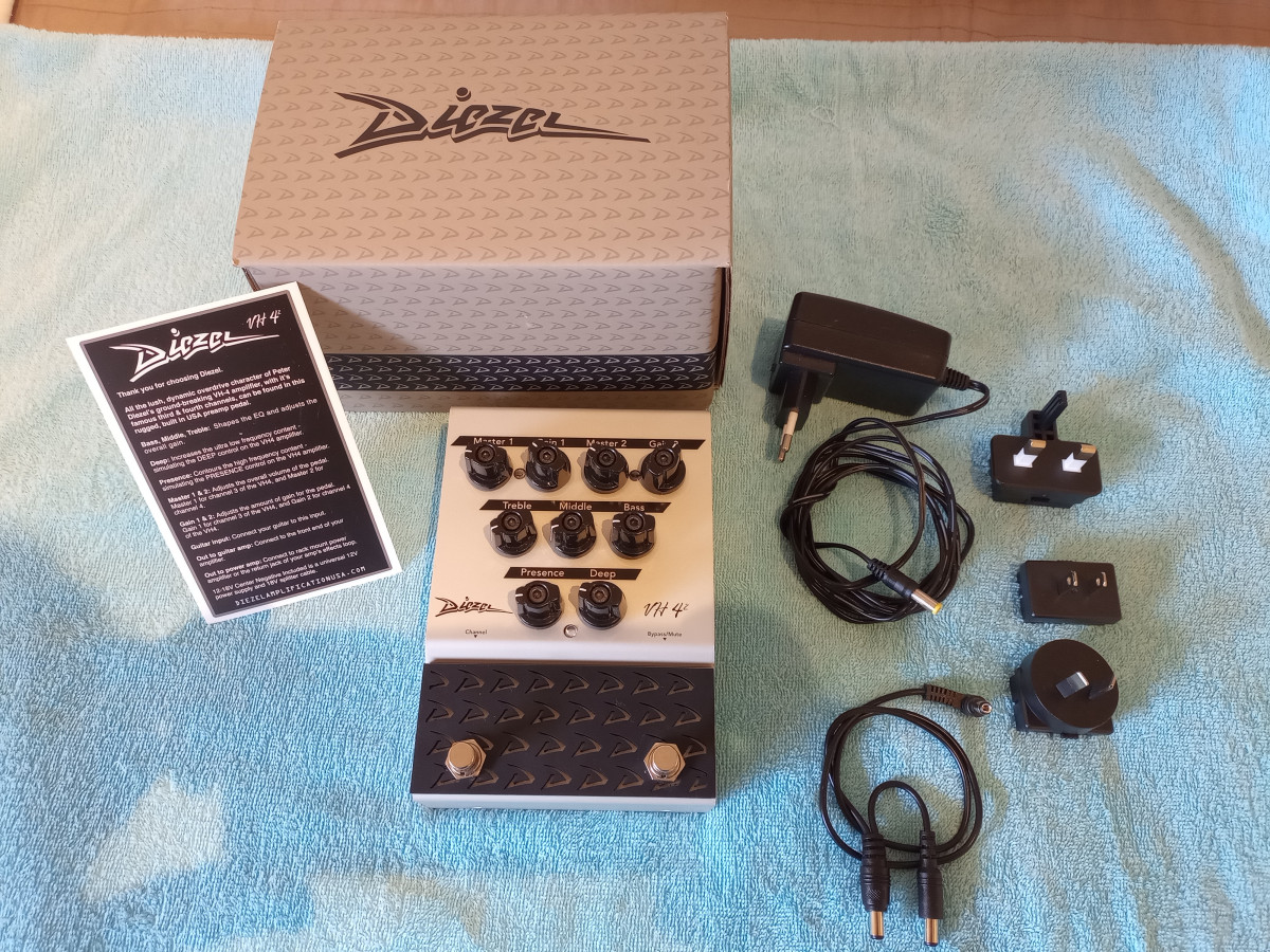 Diezel VH4-2 en perfecto estado. Incluye todo: cables de alimentación, cable duplicador de voltaje para fuente de alimentación externa de 9 voltios y adaptadores de enchufe para diferentes países. Envío incluido en la península.