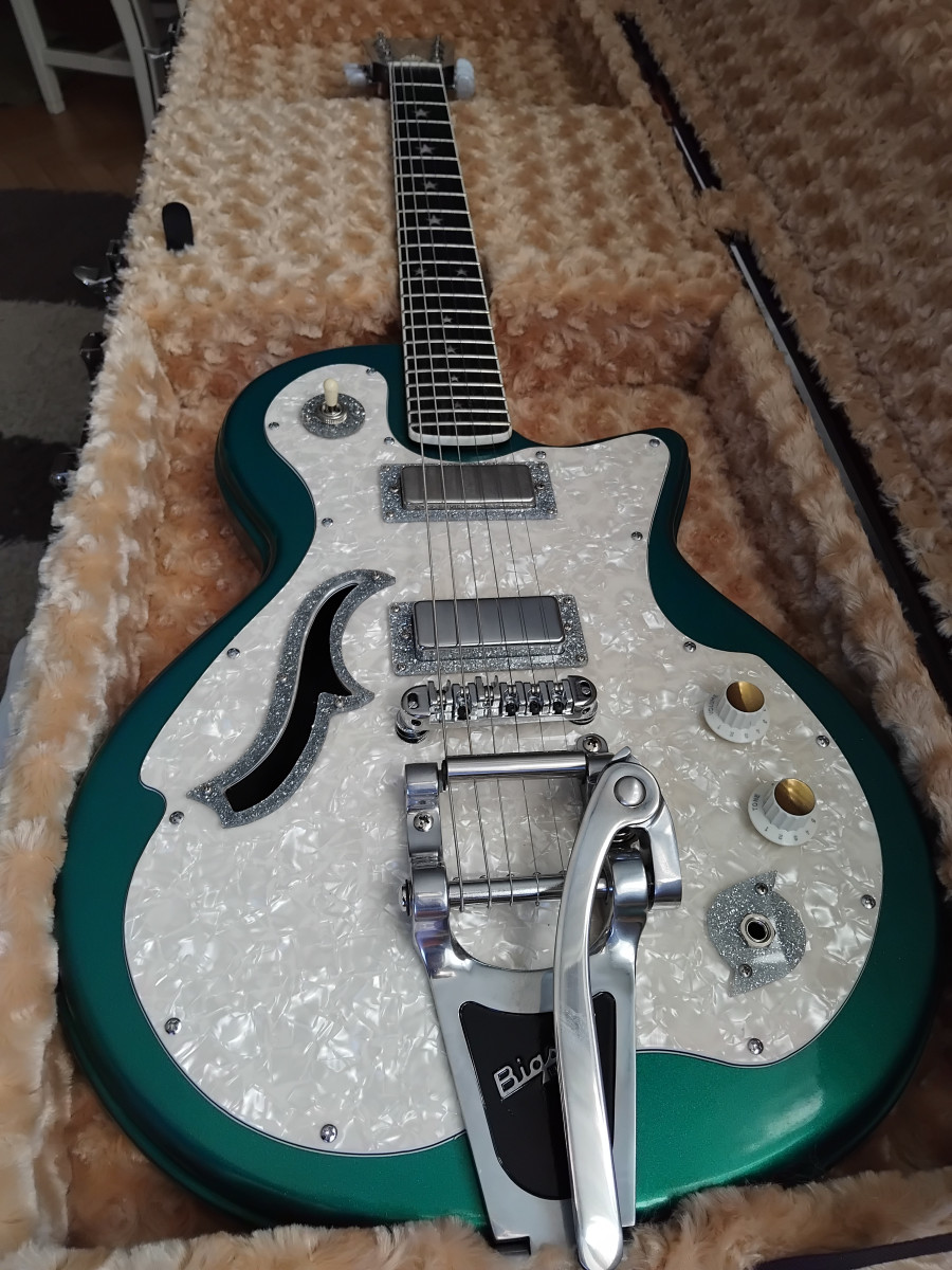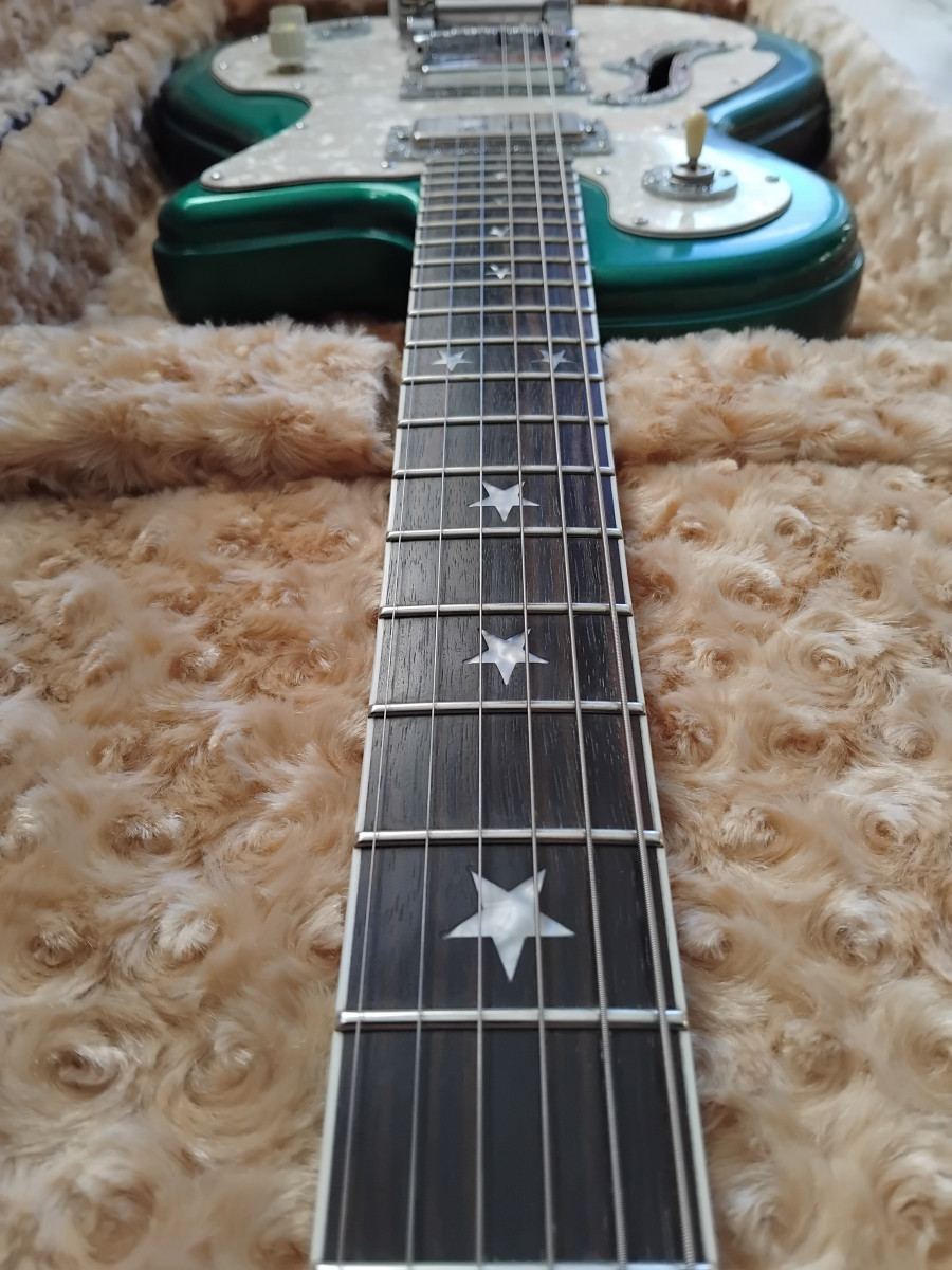 Hola, vendo guitarra americana, distinta y en estado excelente. Color cadillac green, mini humbuckers y diapasón de ébano. Con estuche rígido incluido.
