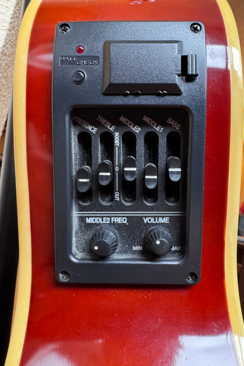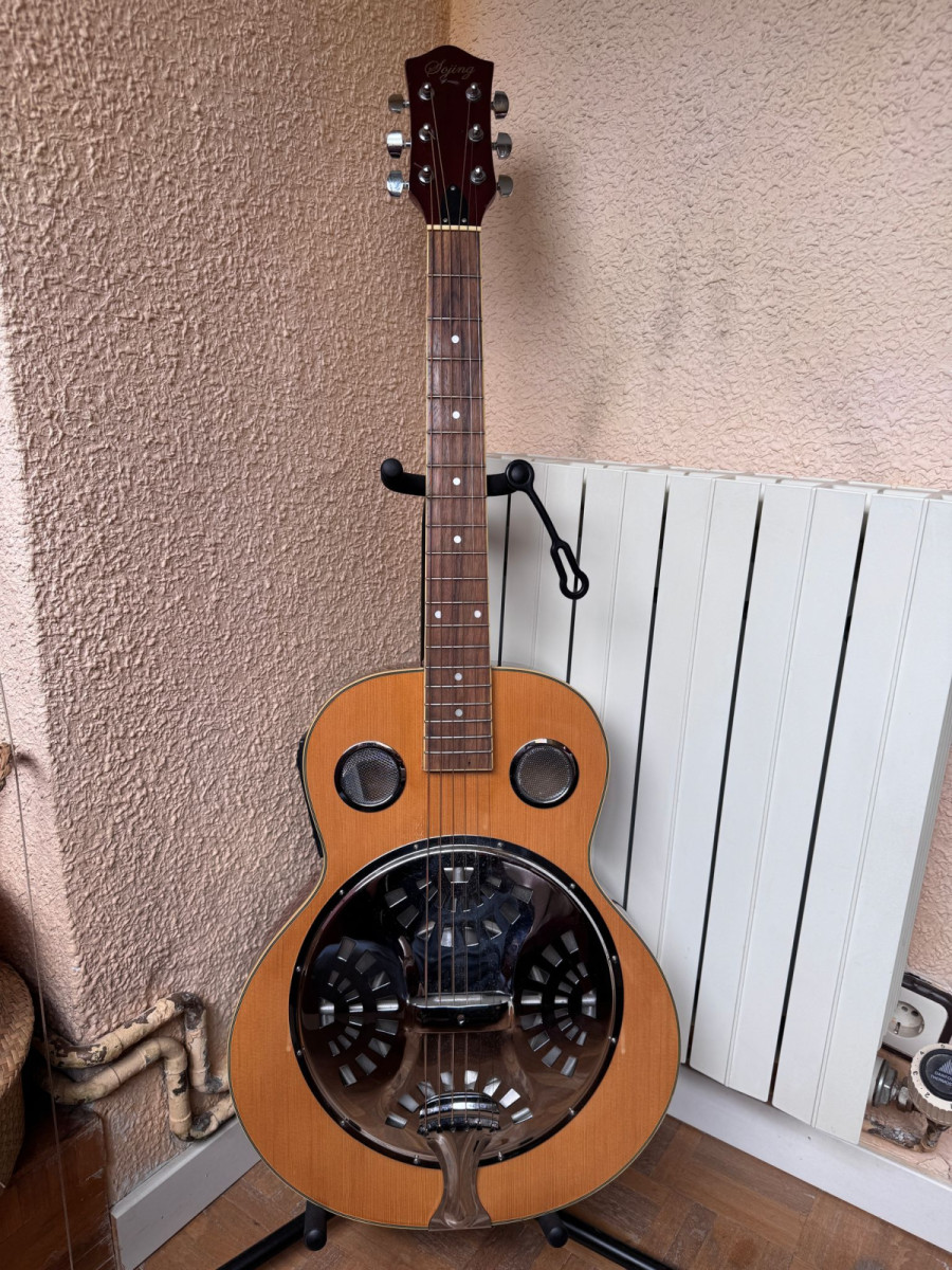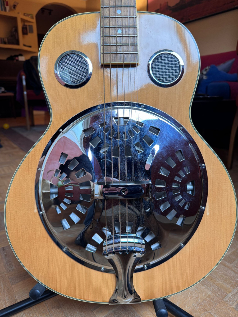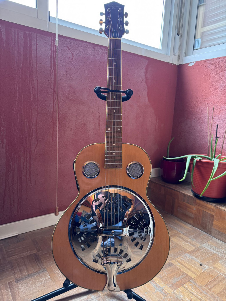 Dobro electroacústico Sojing. De forma acústica suena perfectamente a Dobro. Tiene una pastilla que se activa mediante batería de petaca. Se puede enchufar a un ampli.