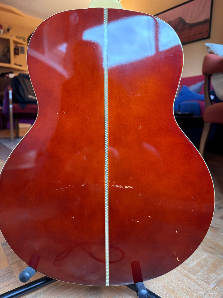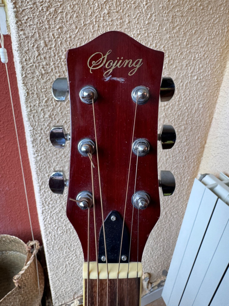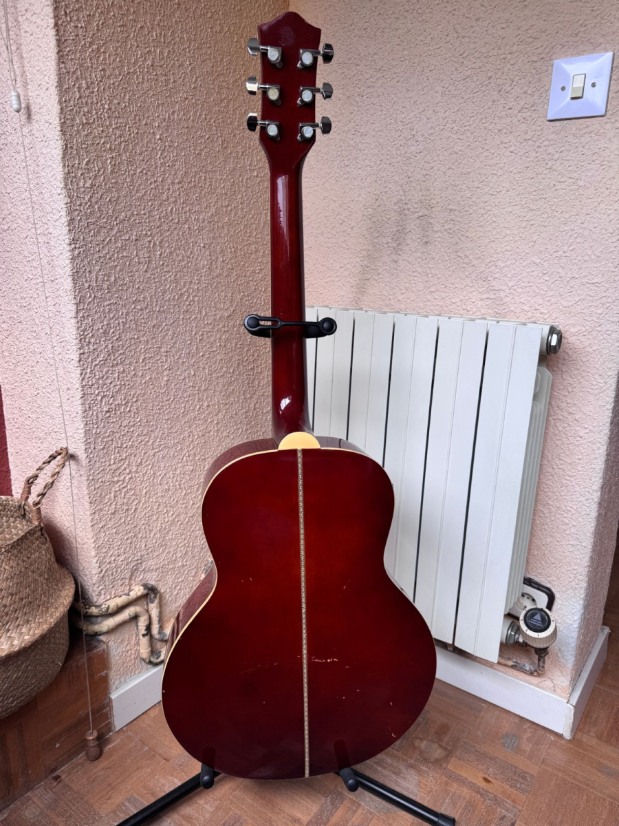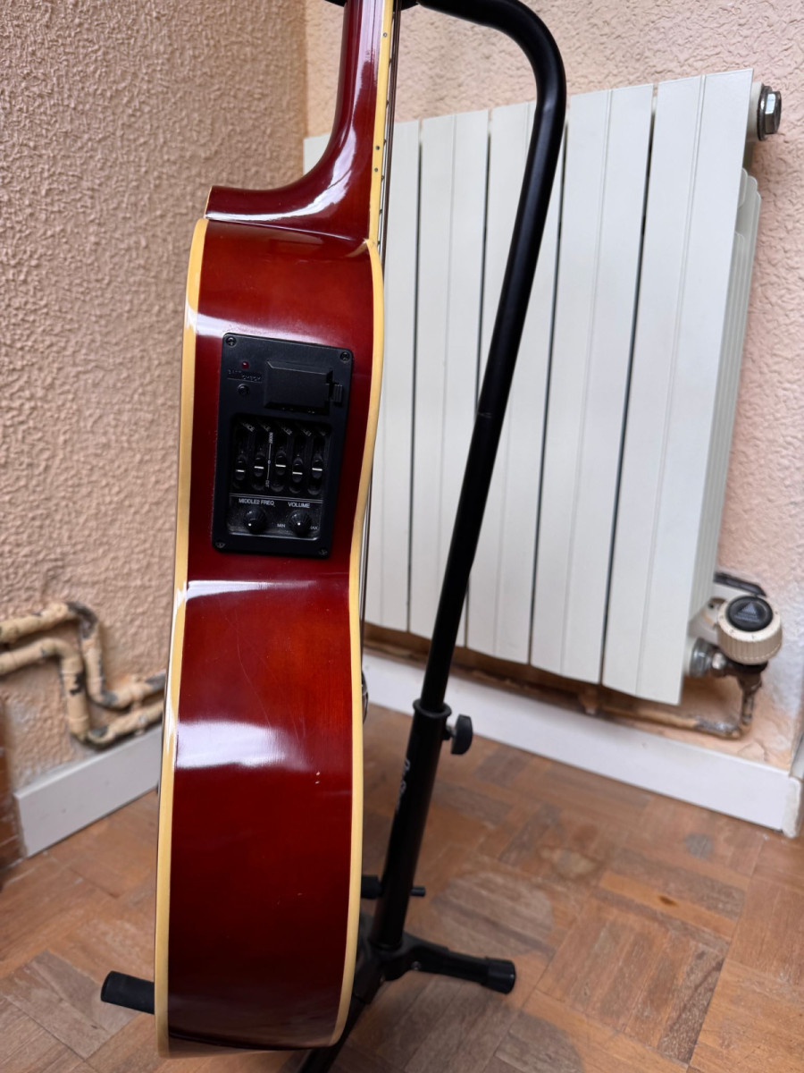 Tiene acción alta para tocar principalmente con slide. Jack de cable un poco desajustado. Una visita a un luthier no vendría mal, sobre todo si quieres tocar con ampli. Tiene algunas marcas de uso. Regalo correa.