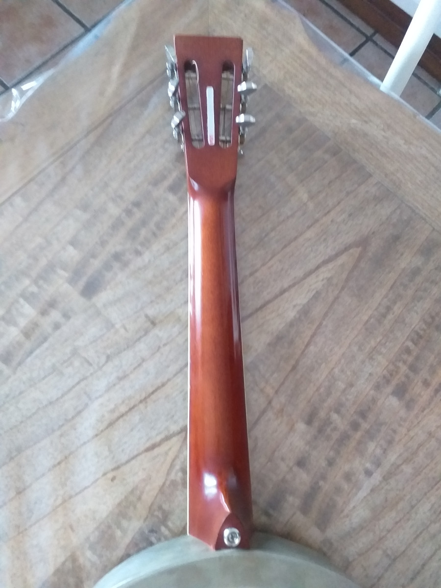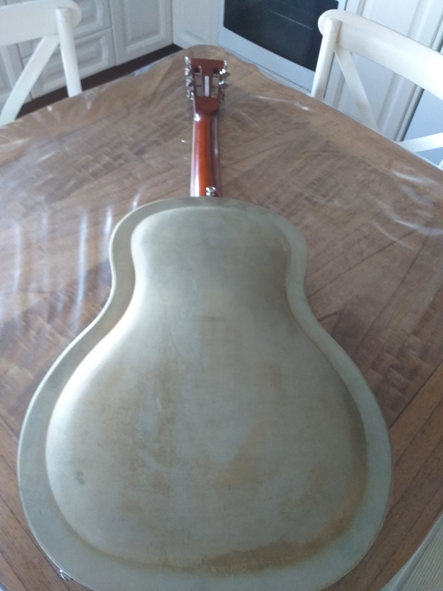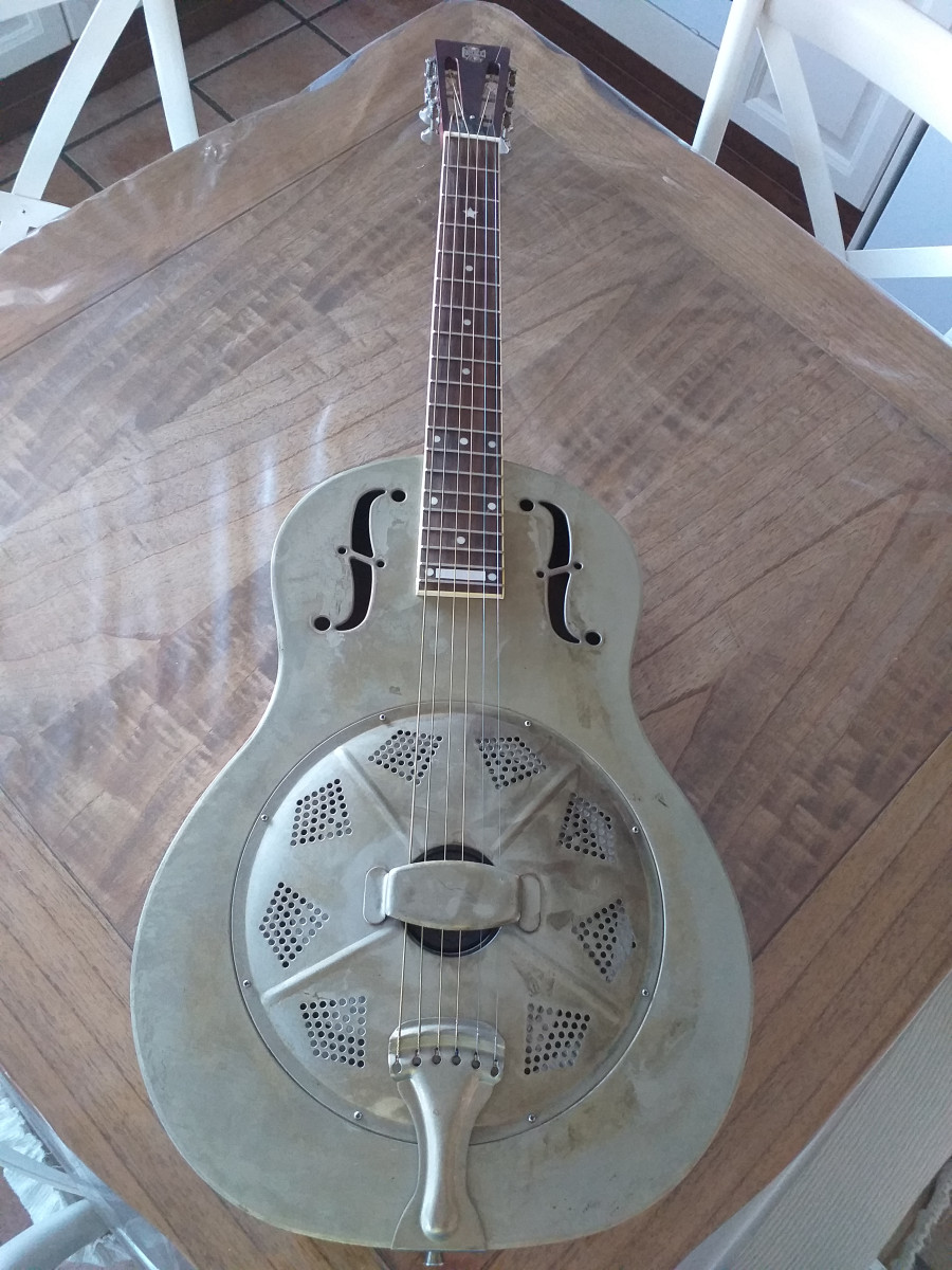 Buenas saco para cambio esta resonadora Republic 505 , estas guitarras se diseñaban en texas para luego ser fabricadas en china , finalmente se enviaban de vuelta a usa para alli ser montadas y ajustadas , esa es almenos la información que yo tengo. Lo importante es que es una copia de una national resofonic que ademas tiene sustituido el cono y la galleta o puente por national originales mejorando enormemente su sonido .lógicamente es ideal para guitarra slide permitiendo tambien tocar con dedos perfectamente.tiene un relick de fabrica muy logrado y el metal es laton de campana .