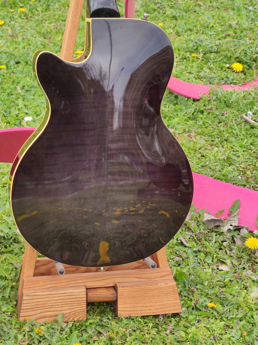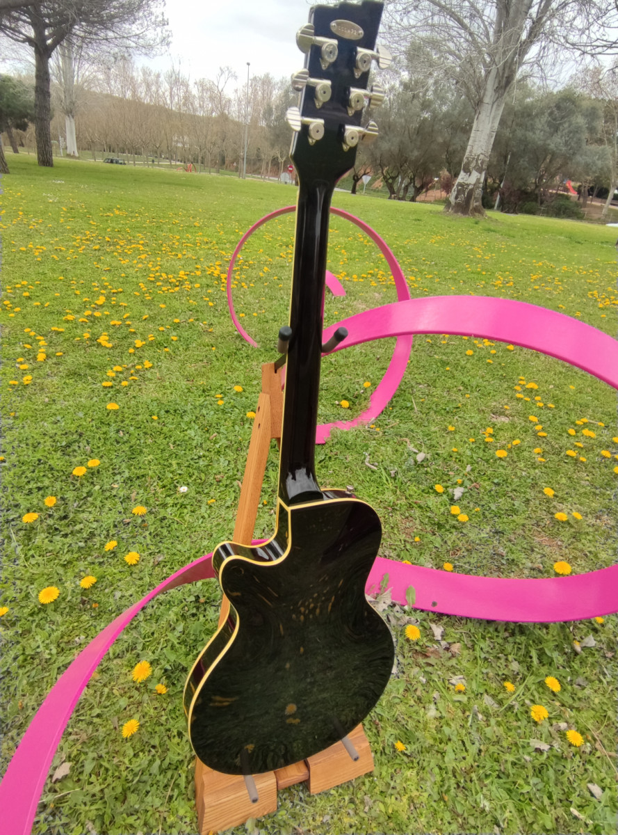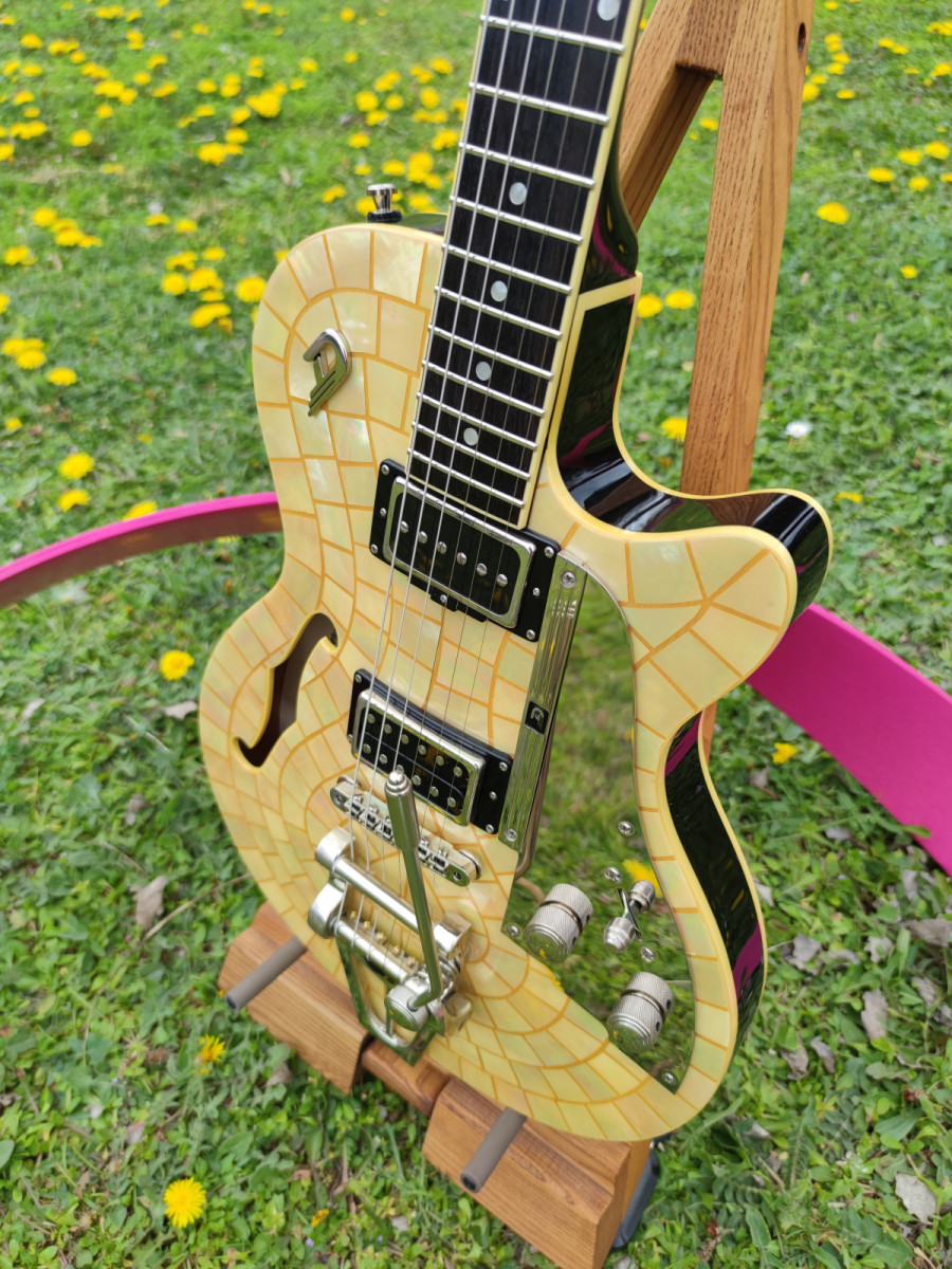 Body Type: Semi-hollow with sustain block, bent sides, f-hole Top: Laminated spruce Back, sides: Laminated flamed maple Size: 46 x 34 cm / 18.11" x 13.38" Height (sides): 4.5 cm / 1.8" Binding: Cream Pickguard: Gold-sparkle, Custom Black, Custom Gold or nickel plated brass