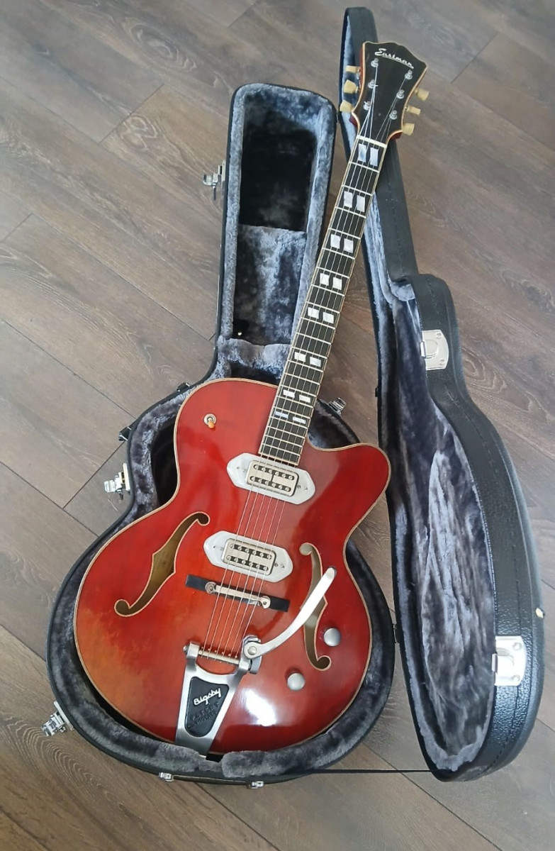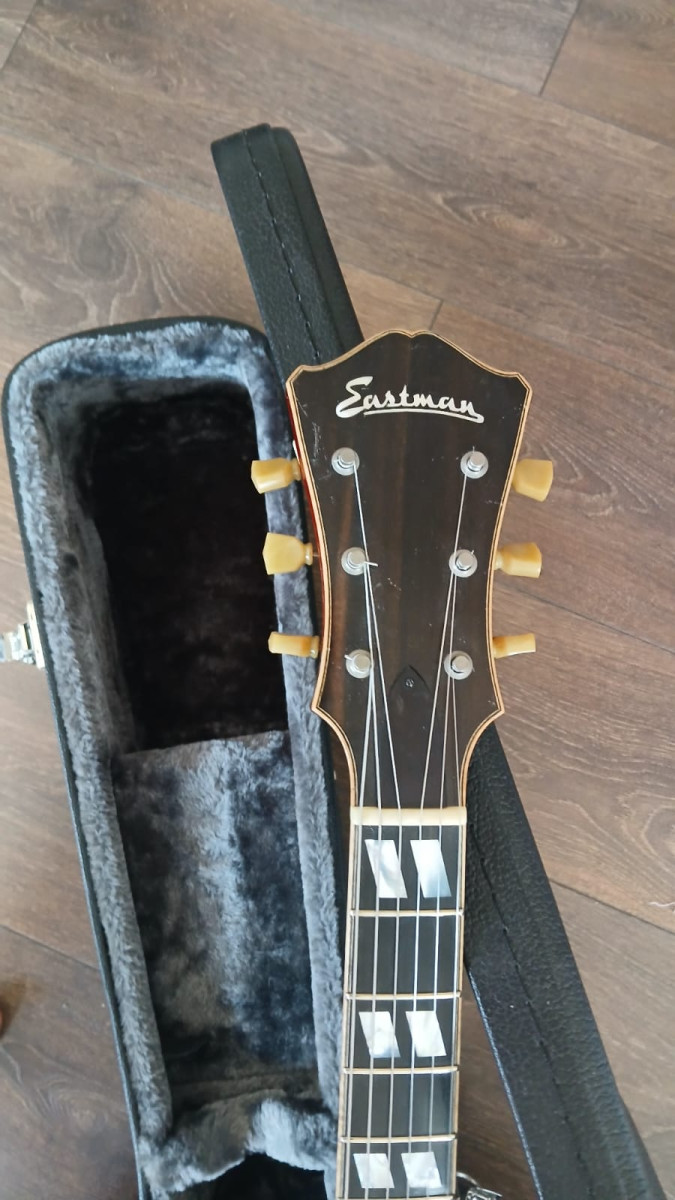 Espectacular guitarra, cuidada al mínimo detalle como es costumbre en lo que hace Eastman. A pesar de que a primera vista, juzgando el aspecto y las pastillas TV Jones, parece una imitación de la Gretsch 6120, en realidad tiene grandes diferencias con ella. La más importante es que la tapa no es laminada como en la Gretsch, sino de abeto macizo tallado. Esto se traduce en un tono y un volumen acústico que no tiene la Gretsch, y un sonido eléctrico también algo distinto y más versátil. Con esta guitarra puedes tocar desde rockabilly hasta jazz y todo lo que caiga en medio.