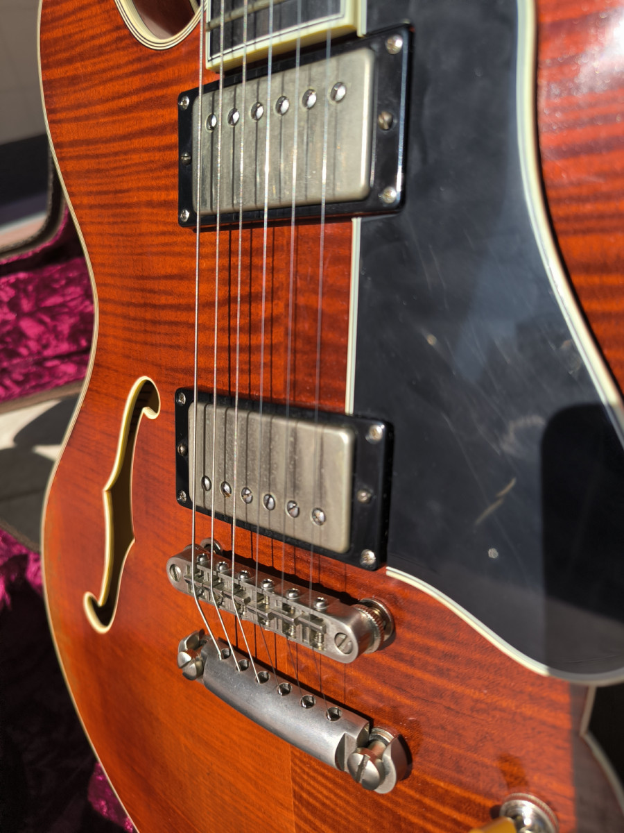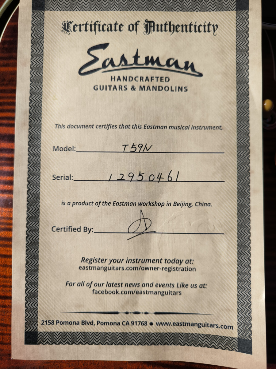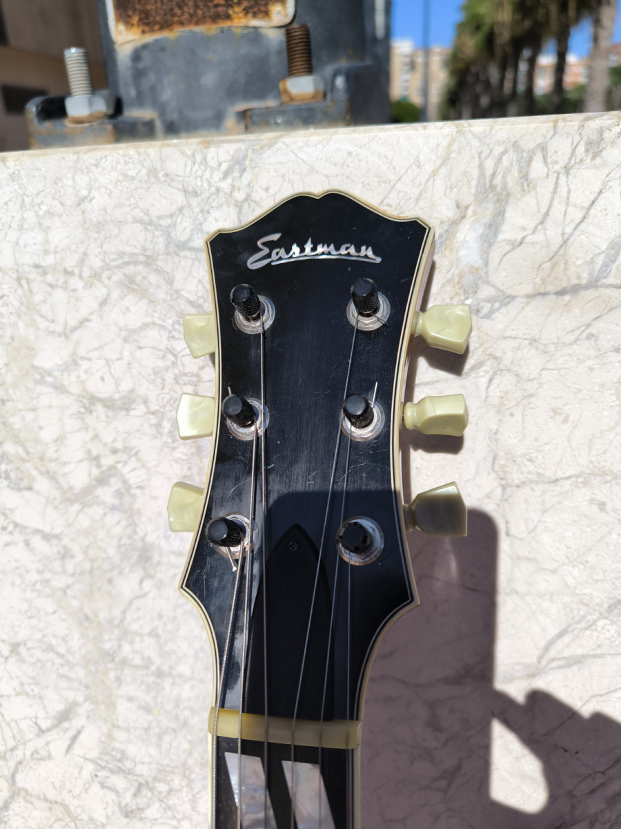 La gama alta de Eastman, nueva ronda los 2150€. Es una guitarra que se merienda literalmente a muchas gibson Custom que he probado, tacto, sonido y look excepcionales. Va con un ligero relic y pintada con el barniz de la gama alta de Eastman, parecido al de un violín, pastillas Seymour Duncan antuiquities (solo las pastillas cuestan 550€).