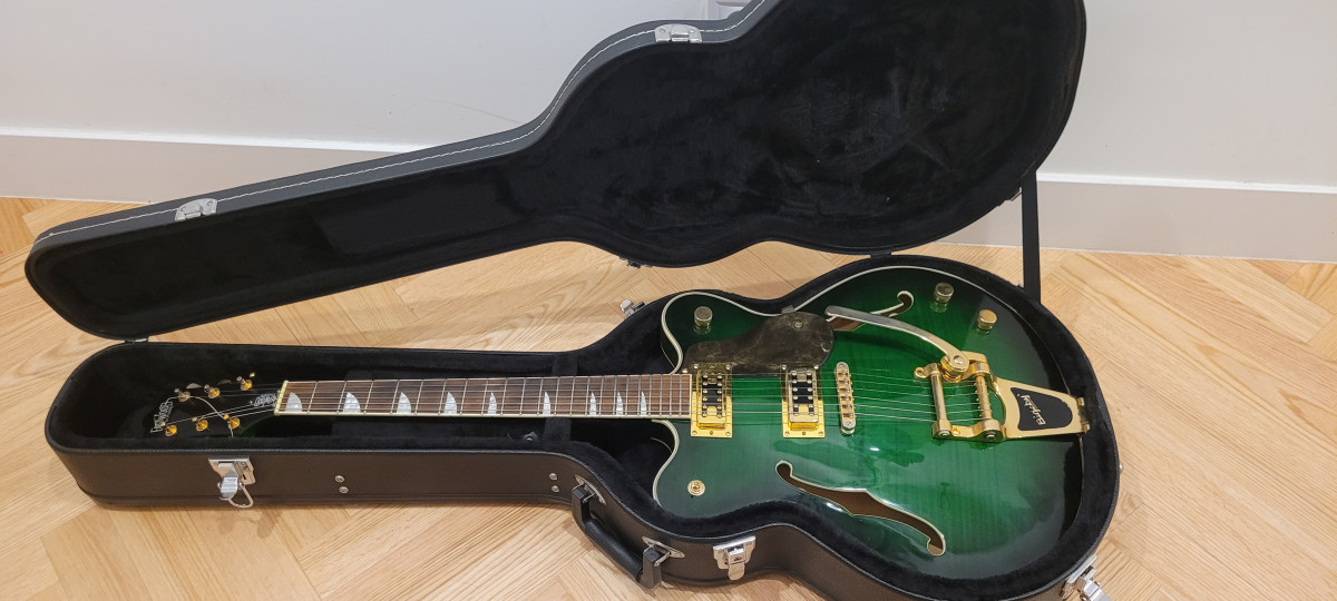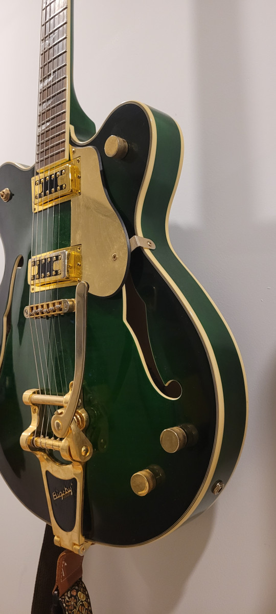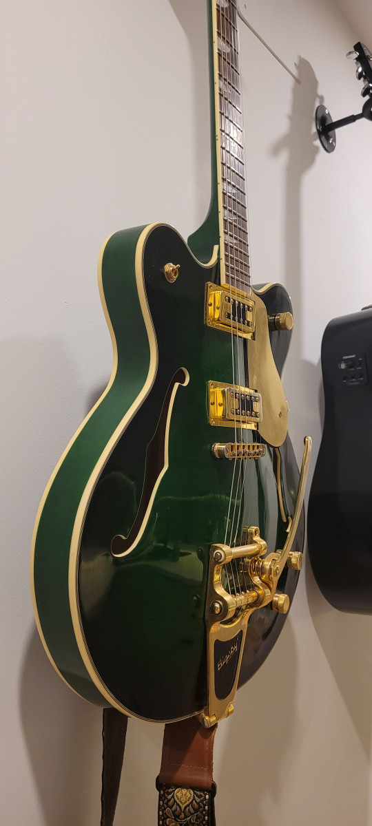 Fácil de tocar, agradecida, versátil, desde jazz hasta rock, con muuuucha potencia de salida si le aprietas un poco, dos humbuckers que suenan clásicos, cuerpo semi hueco que le da una profundidad extra, Bigsby original... Y bonita a más no poder...