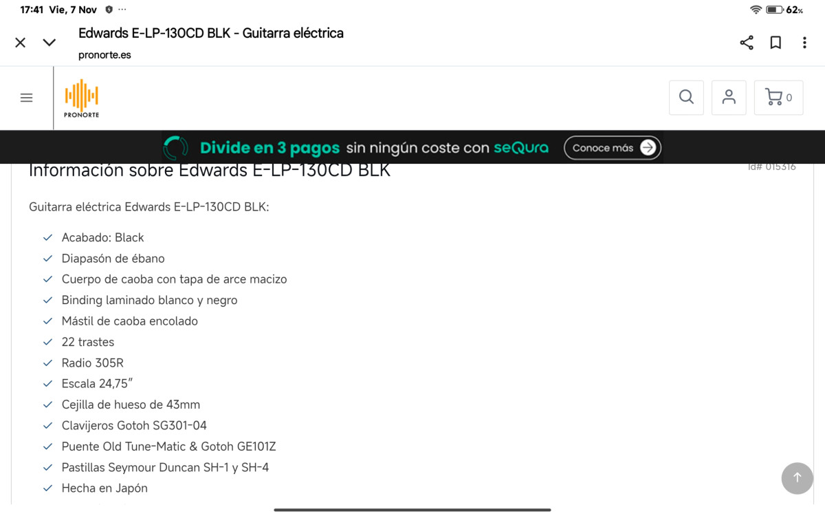 Les paul de alta gama fabricada por ESP en Japon.la vendo porque no me adapto al mastil.iso perfil thin y aunque esta es un pelín más grueso,es suficiente para incomodarme,la guitarra está Virgen ,la he usado 3 veces en casa,vivo en Vigo.trato en mano.La calidad del instrumento es de 10