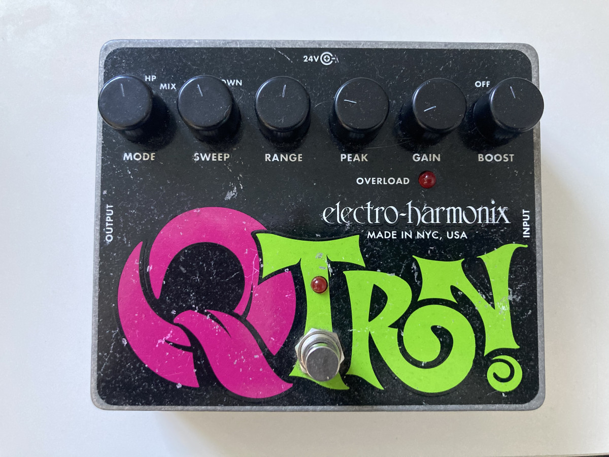 El Electro-Harmonix Q-Tron es un pedal de envelope filter famoso por sus tonos funk y su capacidad para generar efectos de filtrado dinámico. Esta versión destaca por su carcasa llamativa, pintada con colores brillantes y un diseño psicodélico característico de los 90. El Q-Tron reacciona a la intensidad de la interpretación del músico, modulando la frecuencia de corte del filtro según el ataque de la señal, lo que produce un efecto similar al de un wah automático.