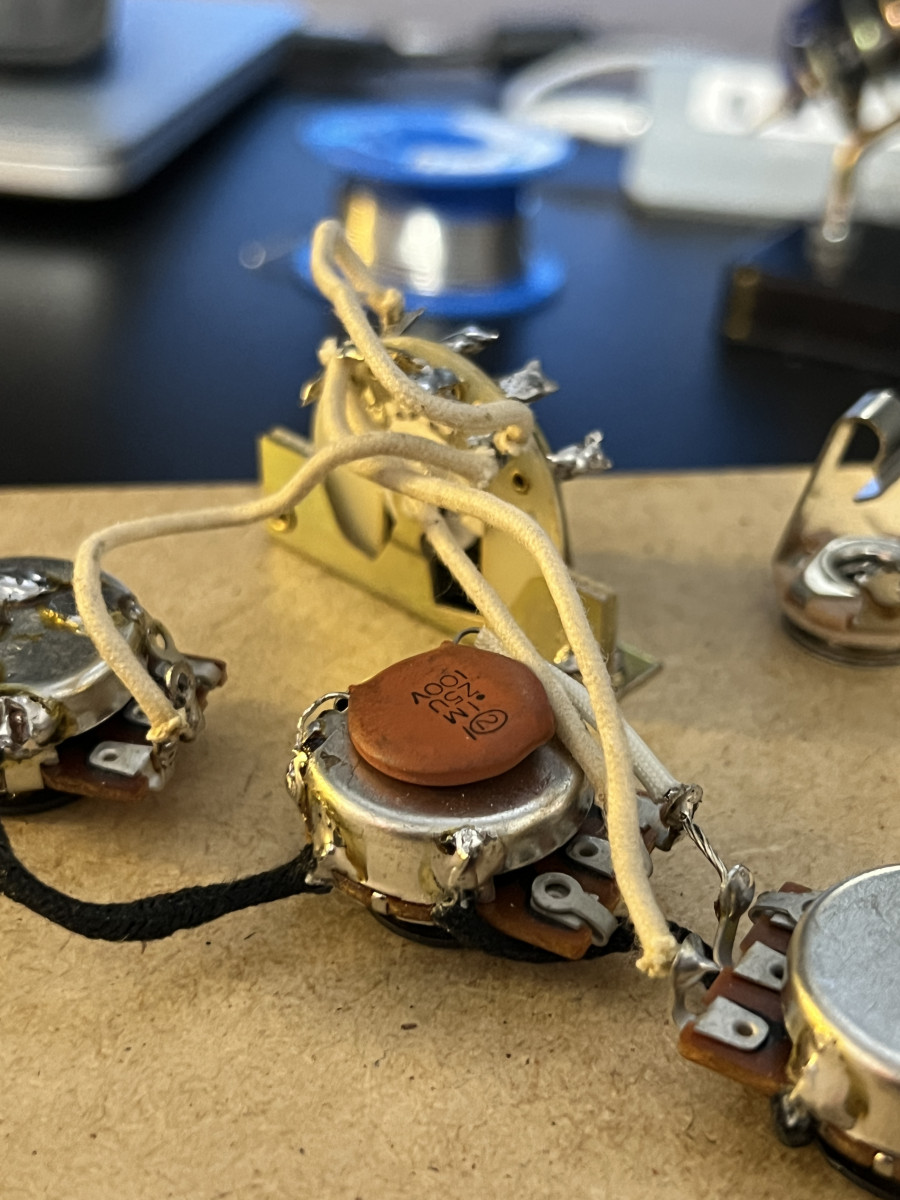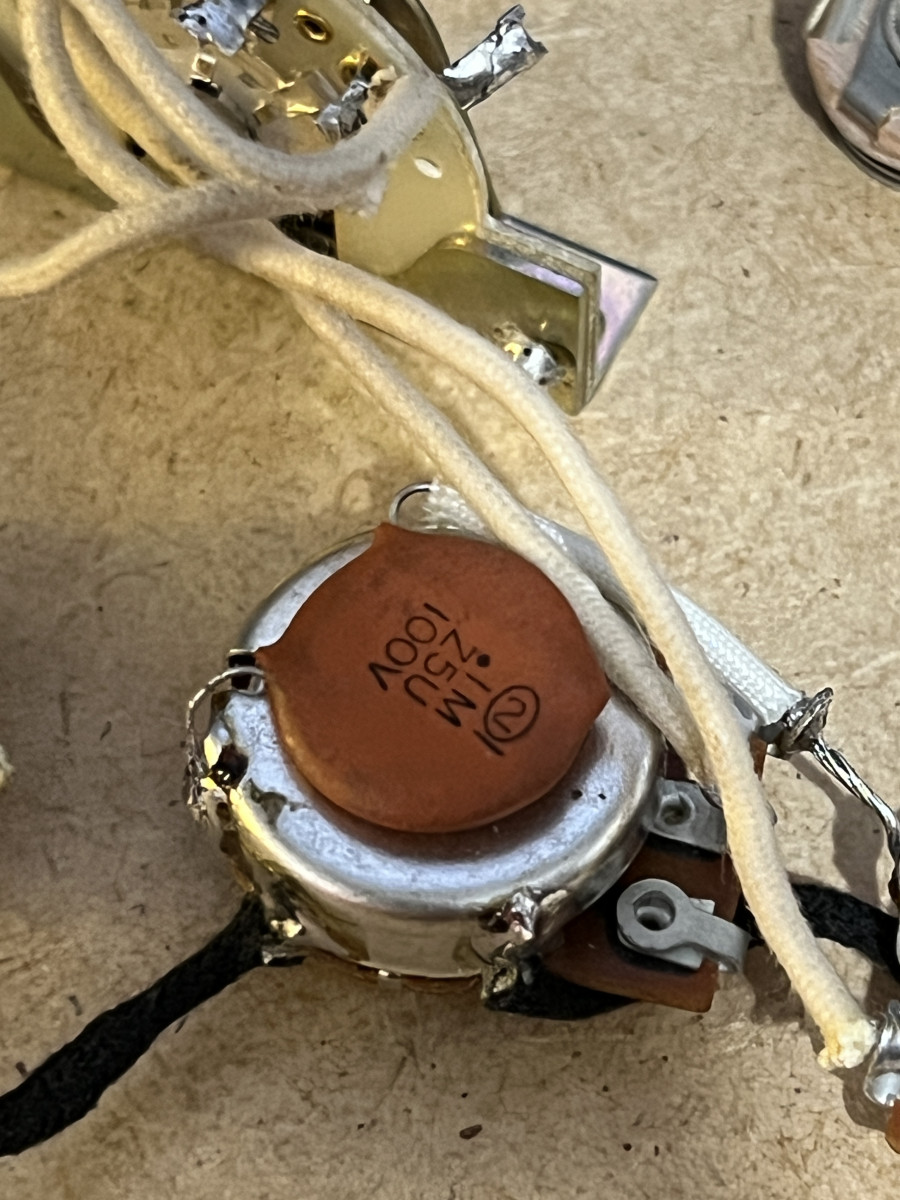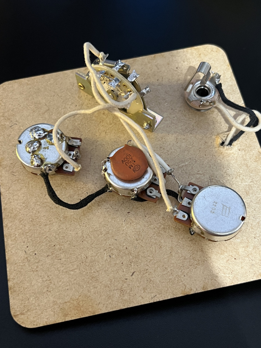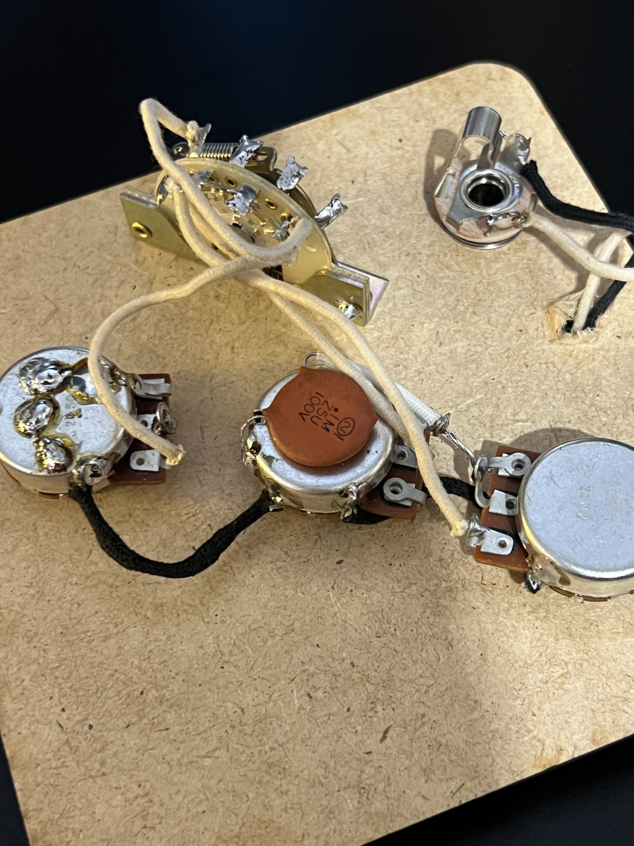 Electrónica para guitarra Fender Stratocaster, estilo 1962. Ideal para proyectos de restauración o modificaciones. Potenciometros Bourns de gran calidad en perfecto estado de funcionamiento. Capacitor cerámico NOS de .1 MFD.