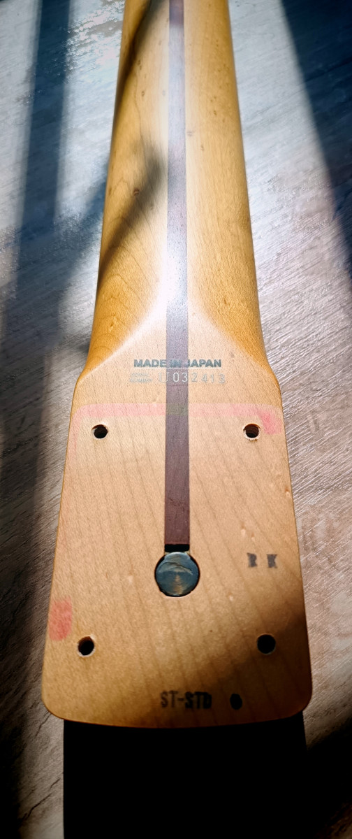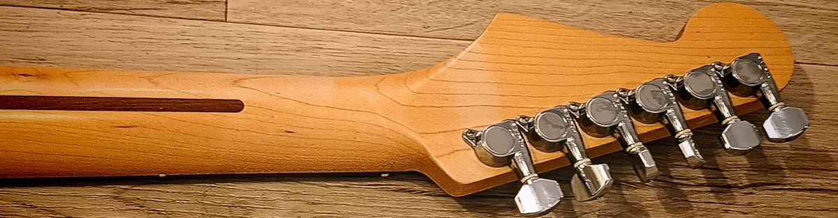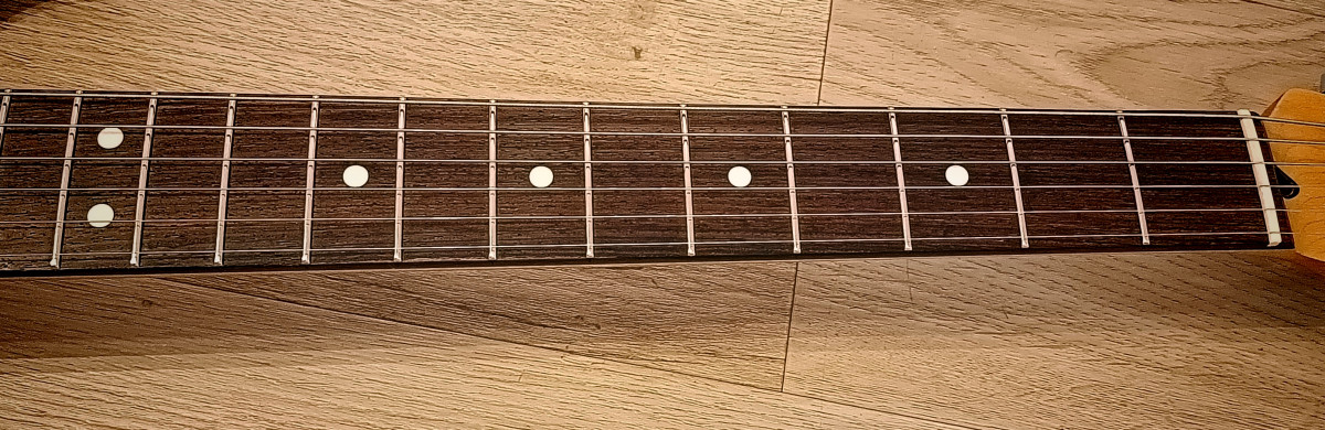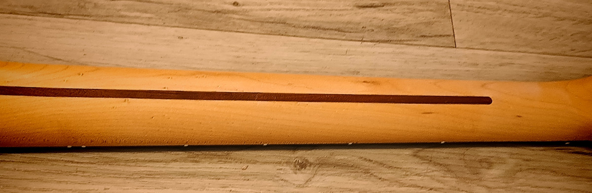 Mástil de maple finito.Diapasón de palorosa que es una delicia tocarlo. Trates perfectos. Radio 9.5. Cejuela 42 mm.