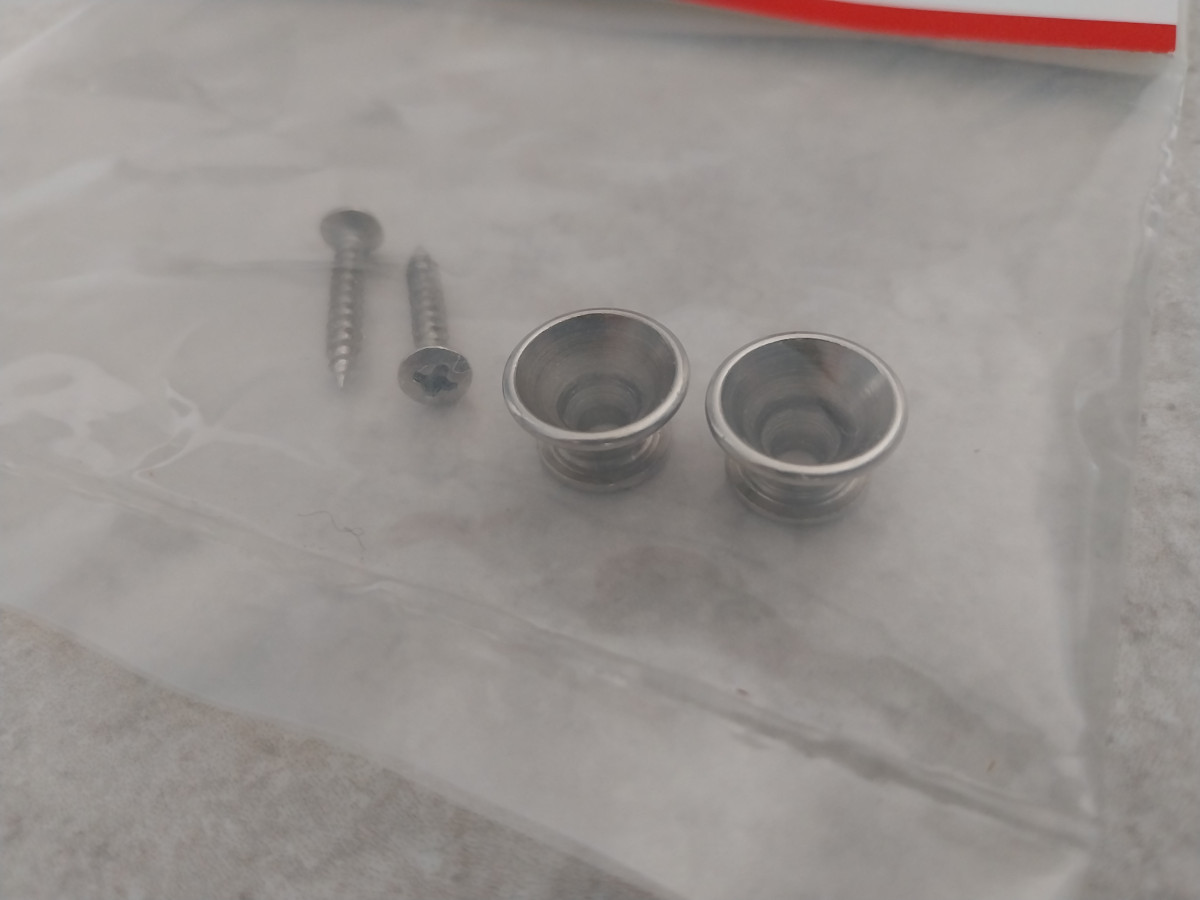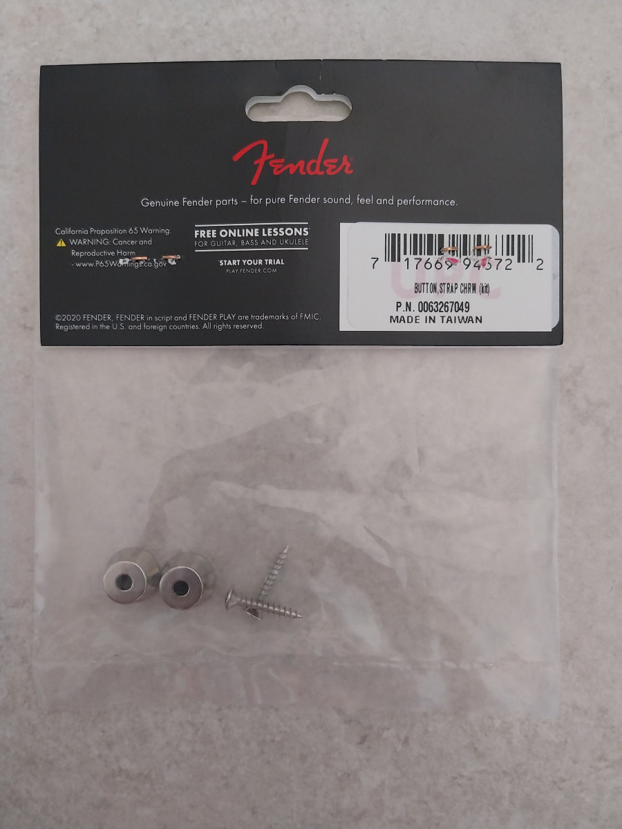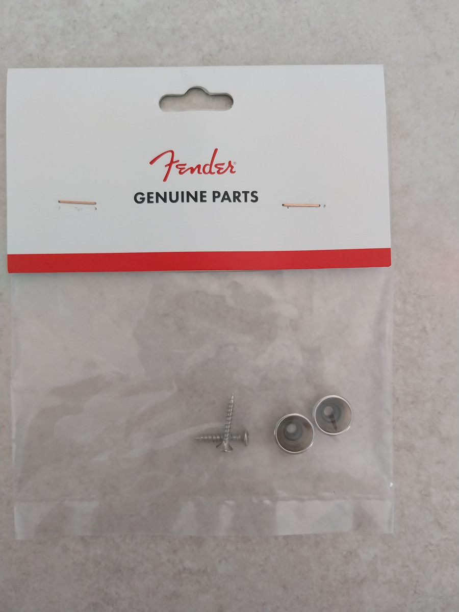 Enganches de correa para guitarras tipo Stratocaster. No originales Fender, fueron desmontados de una guitarra Stratocaster Bygone. Se entregan tal cual aparecen en las fotos.