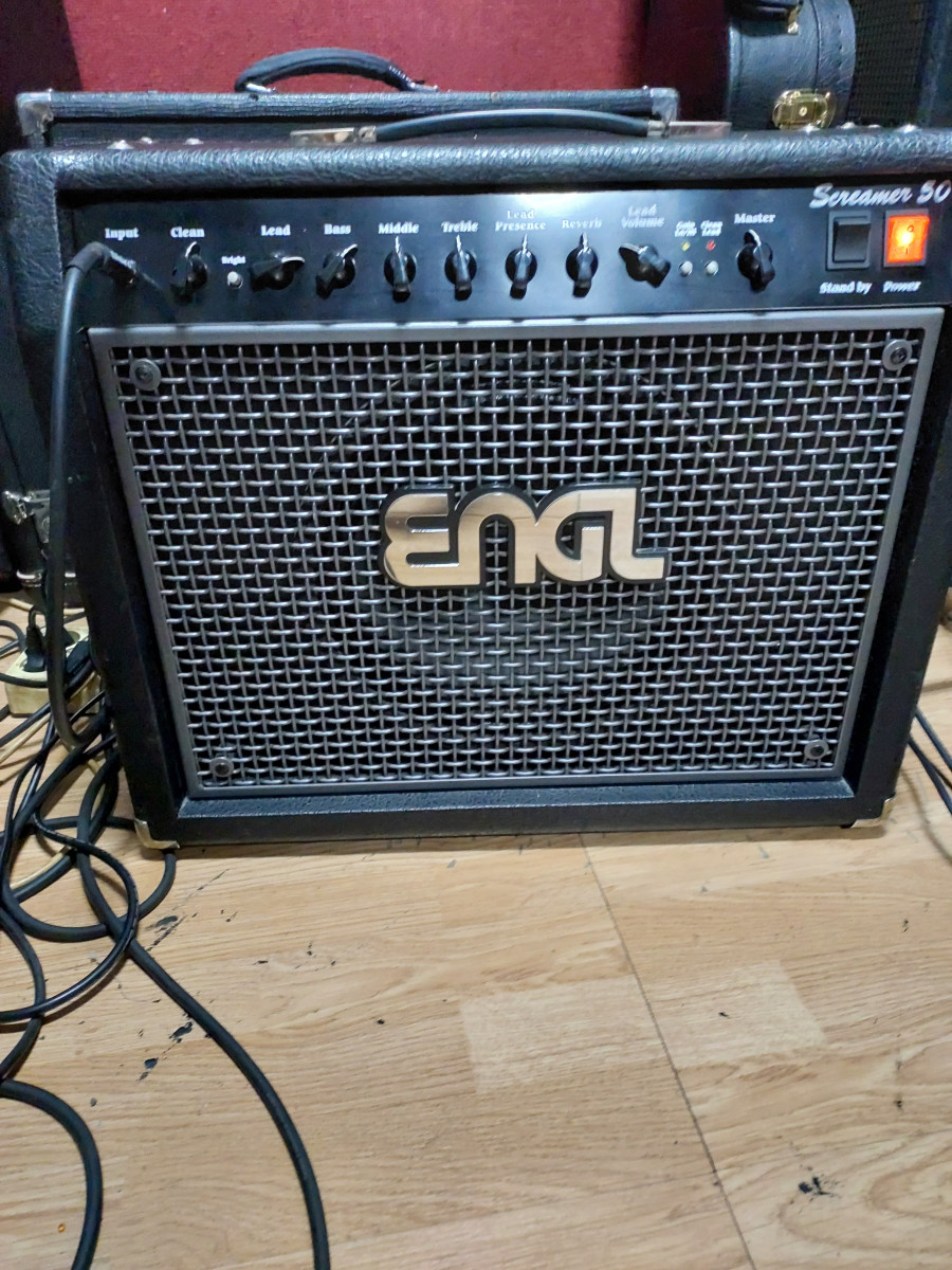 Amplificador Engl Screamer combo 50W, altavoz Celestion Vintage 30 tiene el frontal negro nuevo, la pedalera está currada pero funcional, el cable de la pedalera es nuevo , el ampli está impecable con 4 canales más booster, dos volúmenes master, reverb de muelles, a pesar de su tamaño es una mala bestia