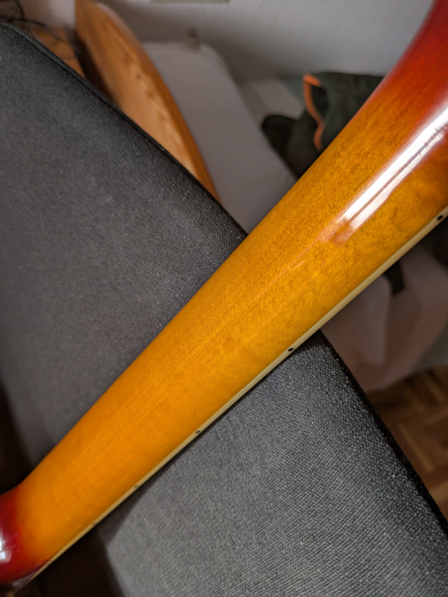 Cómoda de tocar y acción baja. Nada de trasteo (ajustada por el luthier Javier Sendín). Trastes: 9/10 solo ligeramente marcados en los primeros trastes (ver fotos). Alguna pequeña marca pero ningún desconchón. Tiene un treble bleed (instalado por Pancho Ruano) para la pastilla del mástil lo que le hace más versátil.