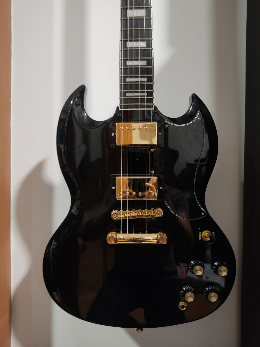 Epiphone sg custom ebony con pastillas gibson 498T y classic del 57. El diapason es ebano. La guitarra esta impecable salvo una marca imperceptible por detras debido a la instalacion de las pastillas nuevas.