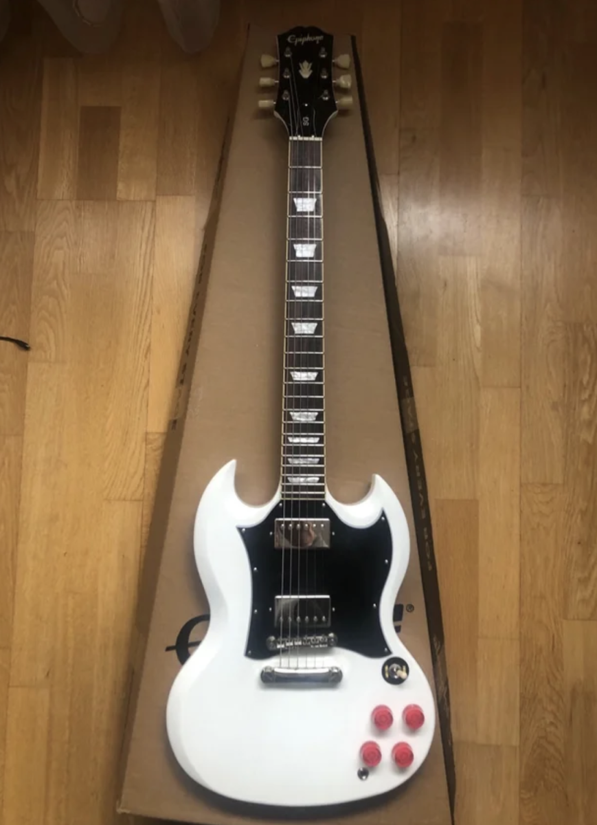 Mantengo la caja de carton de epiphone en la que venia, perfecta para su envio.
