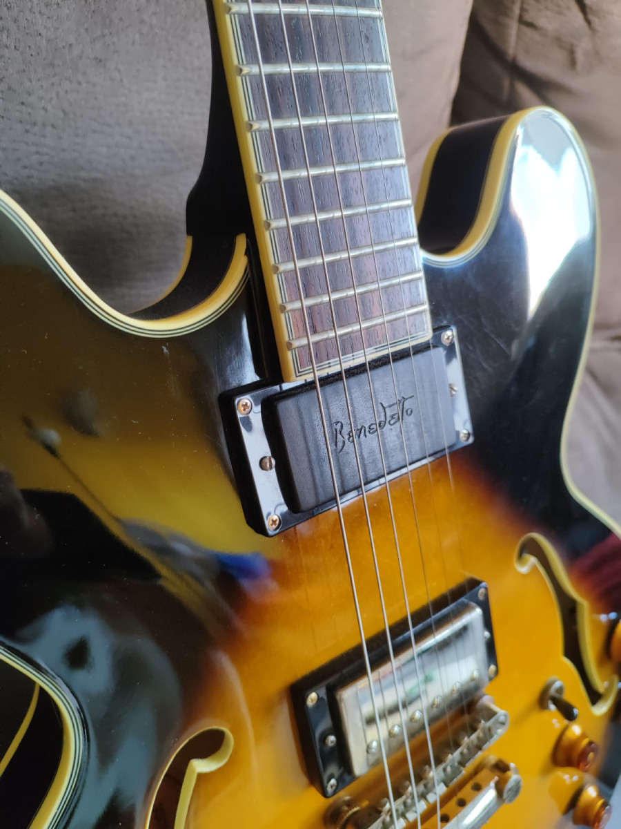 Se le cambio la pastilla del mástil por una Benedetto, que tiene un sonido super gordito y cálido, perfecto para tocar jazz o blues.