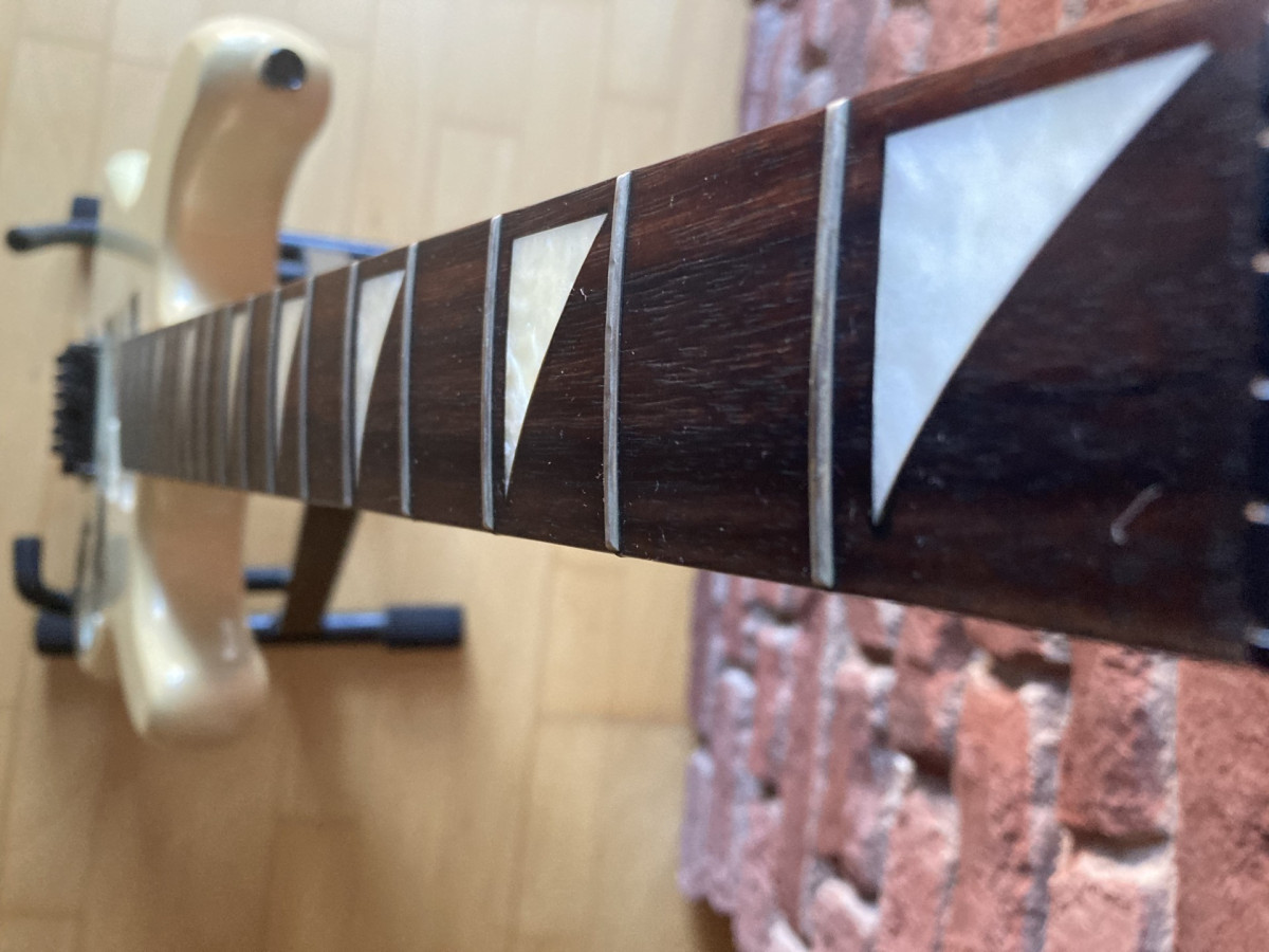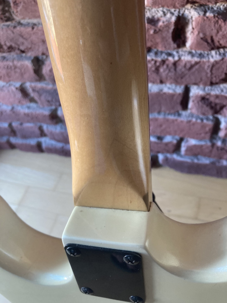 El estado es bastante bueno para su edad, las pastillas tienen algo de óxido. No tiene roturas ni golpes significativos, salvo unos dings aquí y allá. Se vende con su funda. Los tornillos, el alma y los microafinadores del puente funcionan perfectamente, se adjunta la tornillería antigua y un juego de tornillos nuevos.