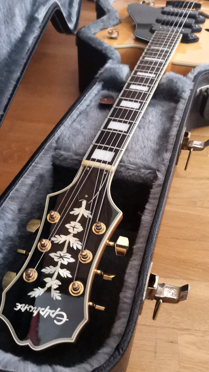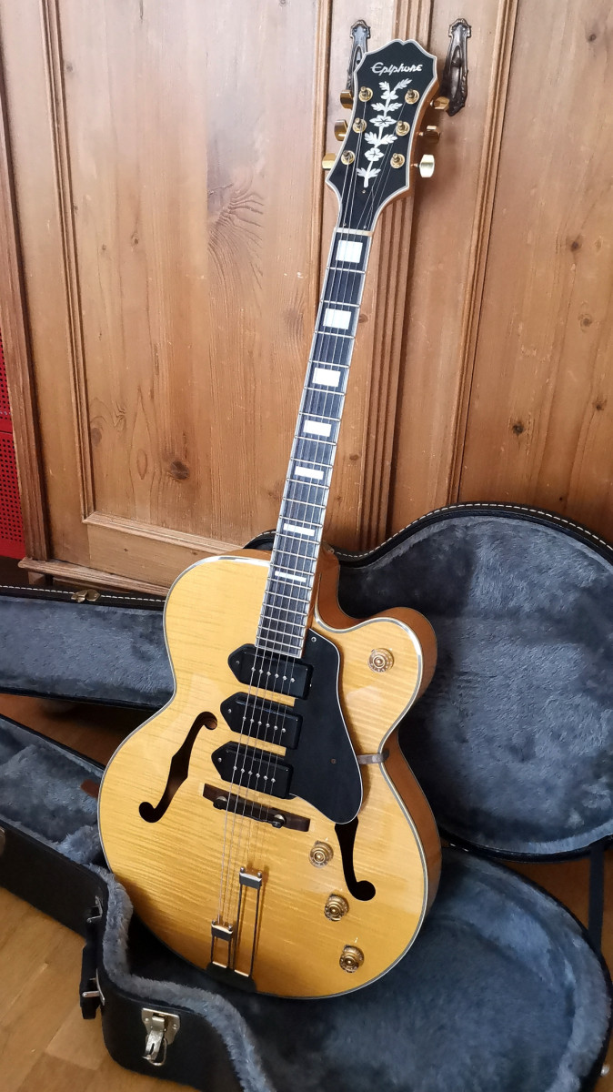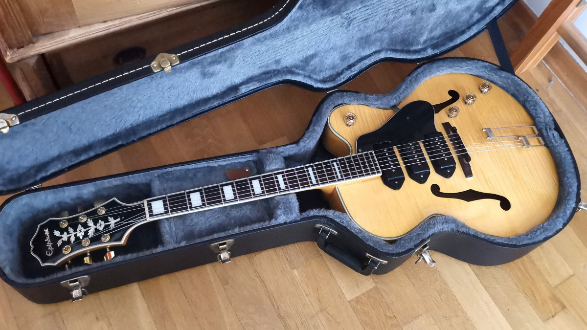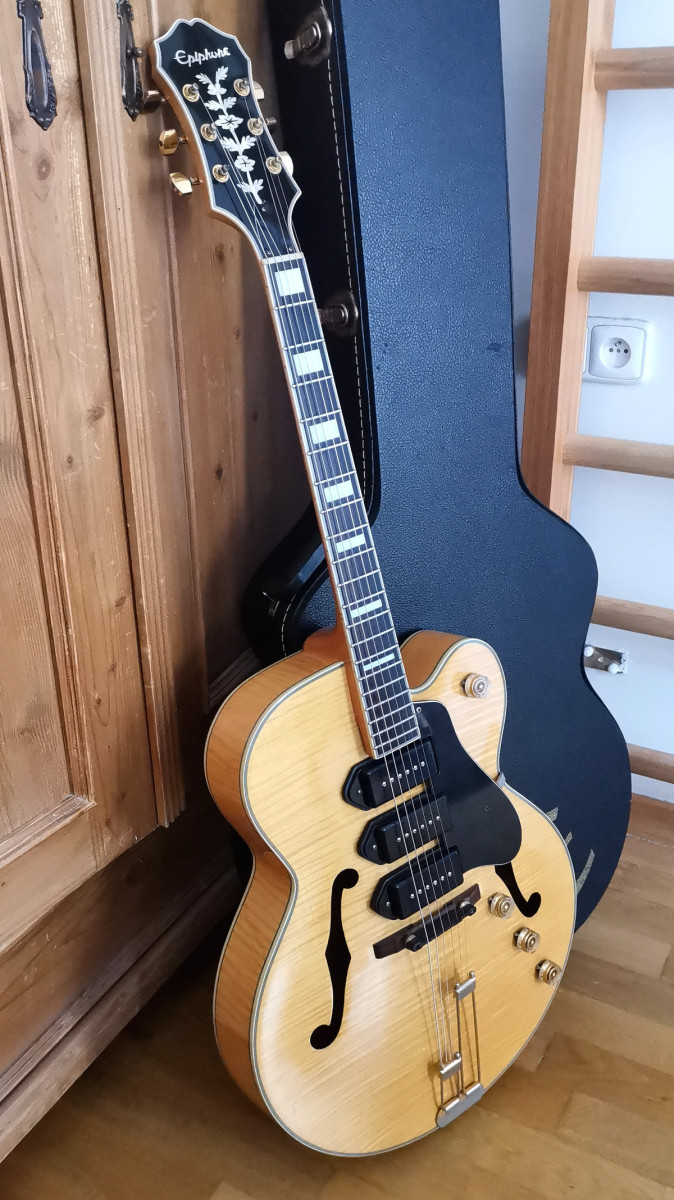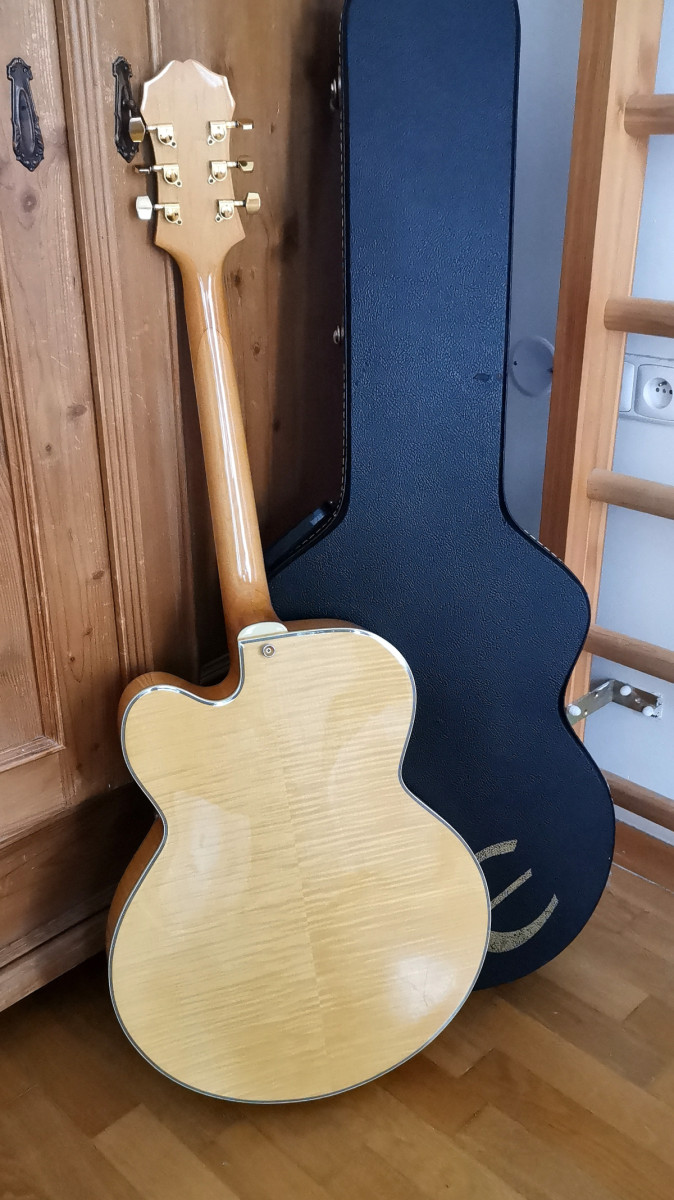 Una maravillosa Epiphone Zephyr en aun mas sexy acabado natural, y con 24 añitos a sus lomos, mas que bien conservados. Viene con su, tambien en perfecto estado, estuche original que no venia con la guitarra. Como le ocurre a su hermana, pocas se ven y menos en este estado.