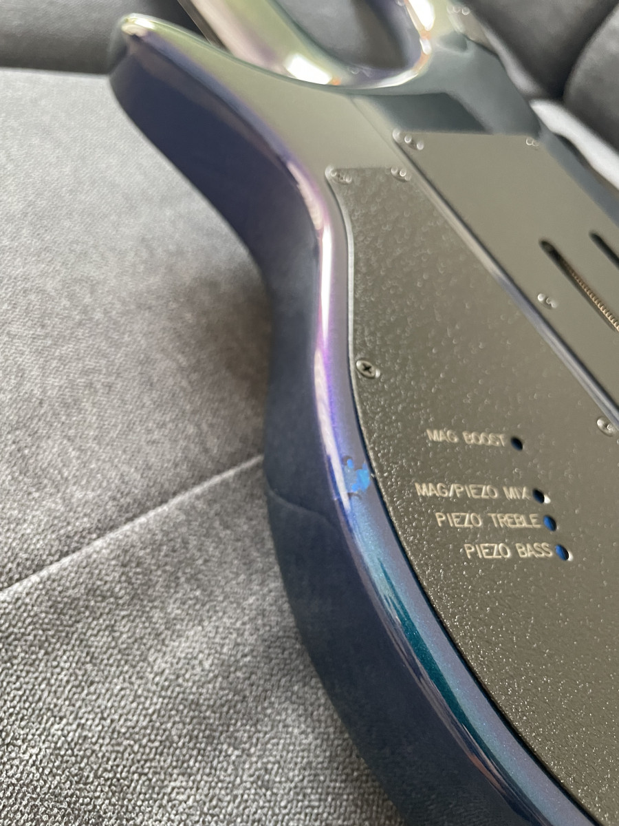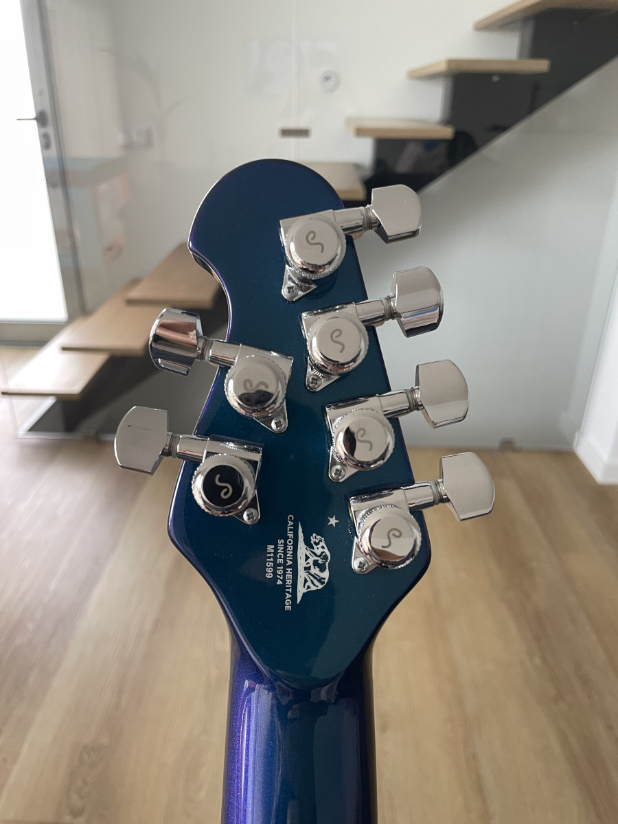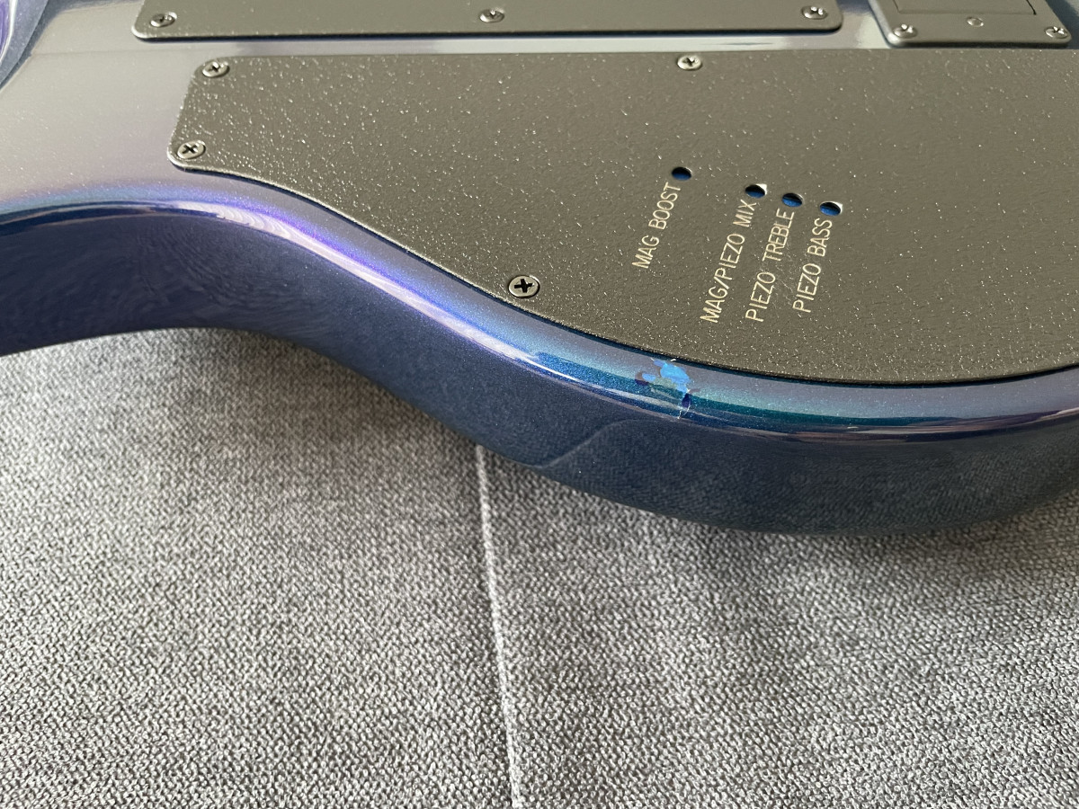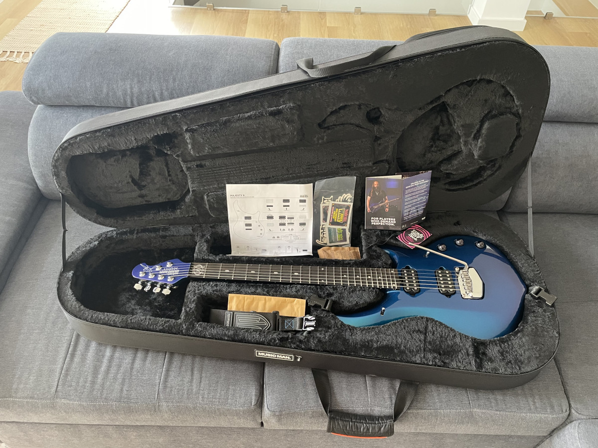 The instruments is in perfect condition. Fully working order, no issues on the V1.0 preamp (Piezo and Magnetic). Full case andy. Goes with the new Music Man Mono Case.