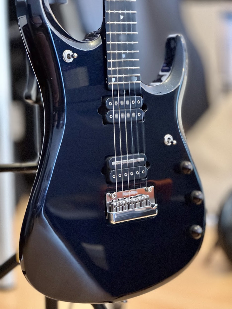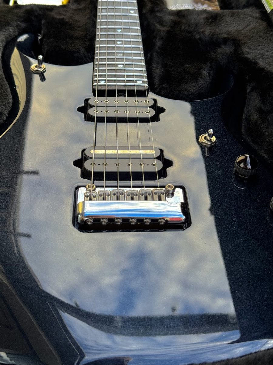 Como nueva. Ni un solo arañazo, ding o marca de cinturón. Una de las guitarras mas cómodas que he tenido. El radio de 20" es de locos. He intentado fotografiar de distintas maneras para que se vea el color. Es como un negro carpaint que tira un poco al azul. Cuerdas y ajuste en Luthier recién hecho. Afinación E Standard.