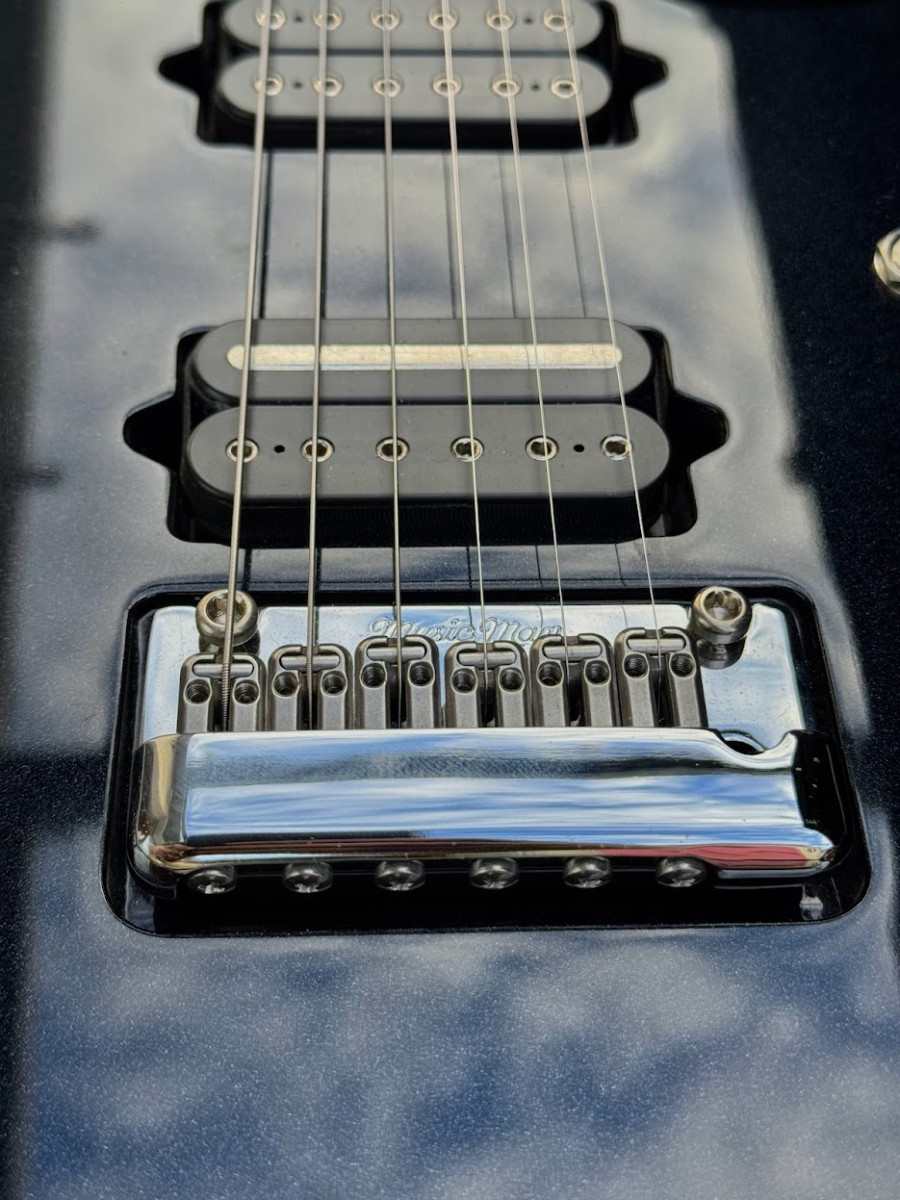 Bridge: Custom John Petrucci Music Man® Piezo floating tremolo, made of chrome plated, hardened steel with solid steel saddles