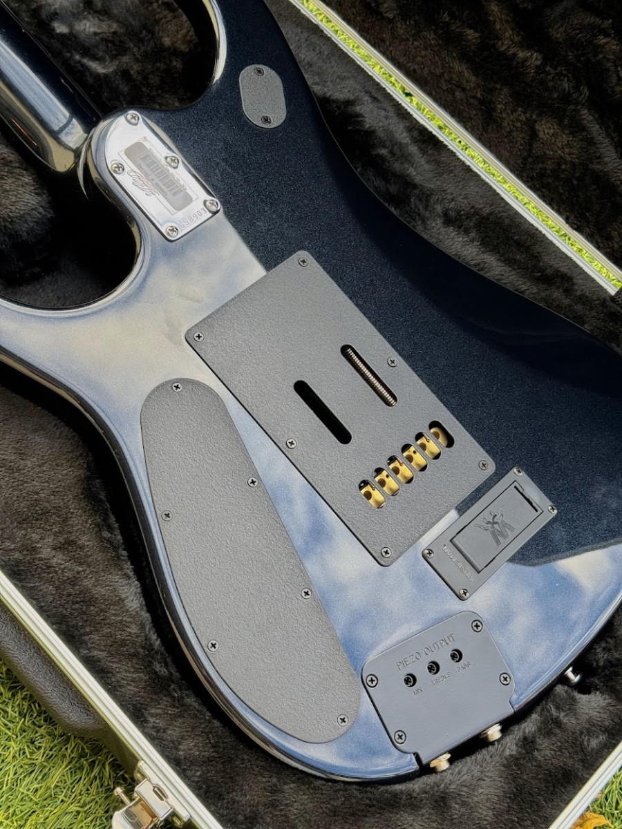 Switching: 3-way toggle pickup selector, with custom center position configuration; 3-way toggle piezo/magnetic selector