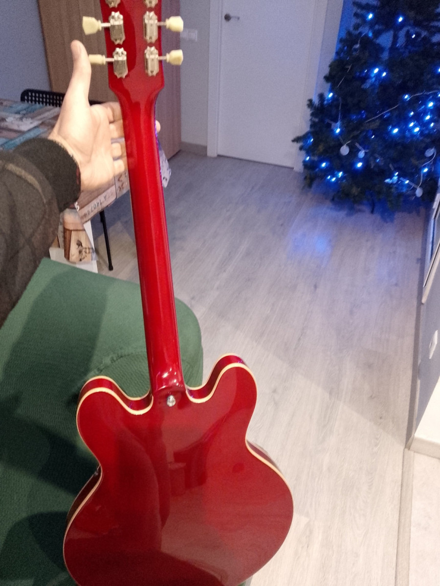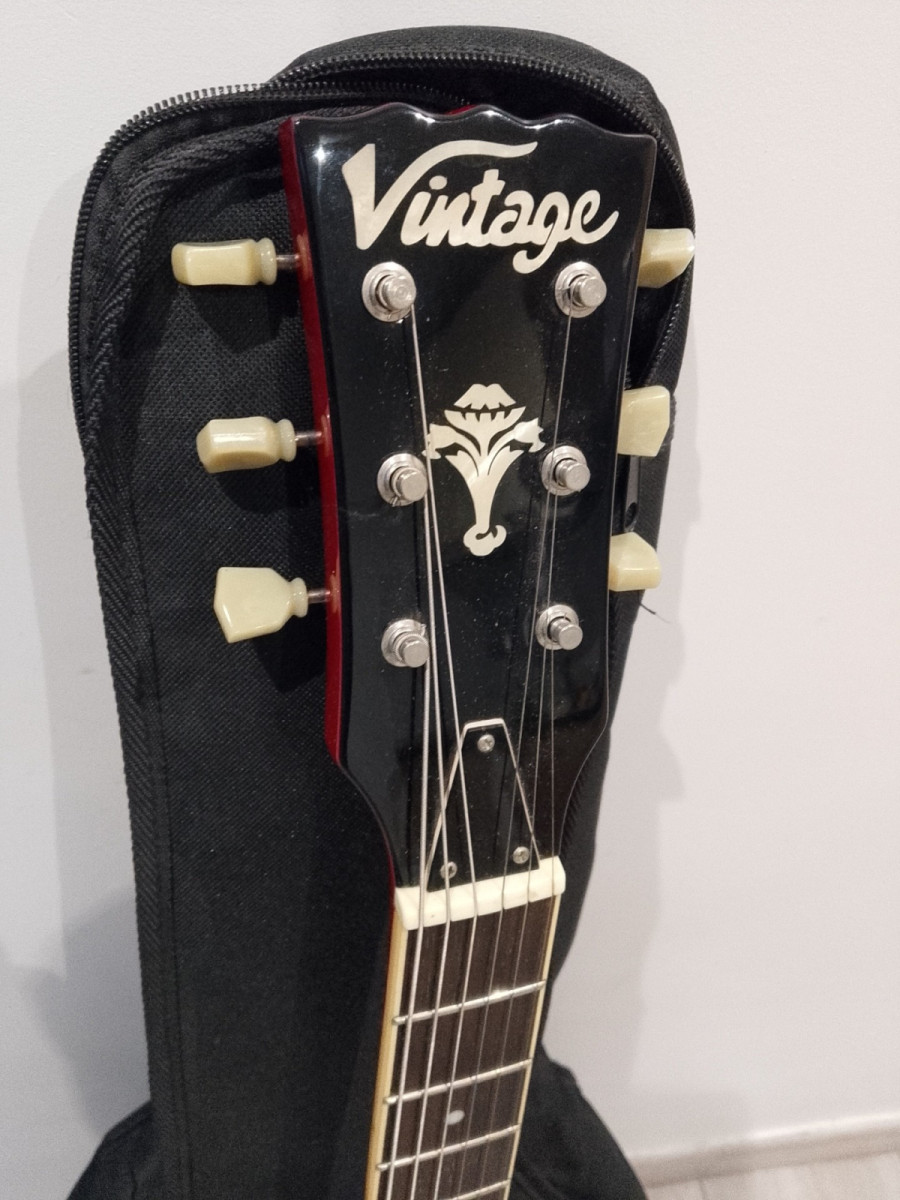 Guitarra marca Vintage VSA 535, réplica ES 335 con pastillas Wilkinson y afinadores cambiados a Kluson Deluxe. Una muy buena réplica de la 335.