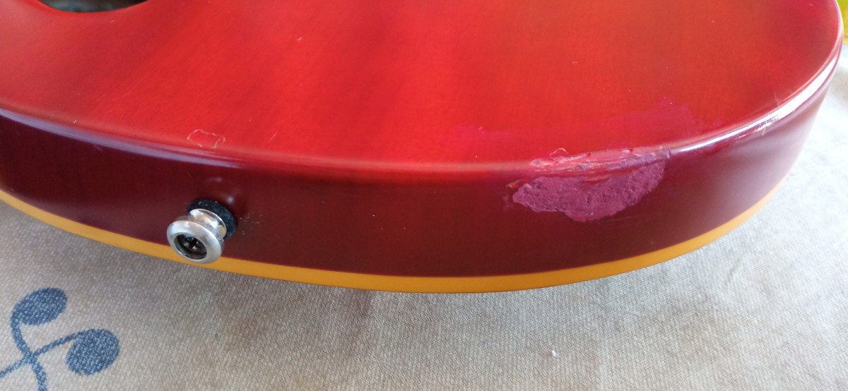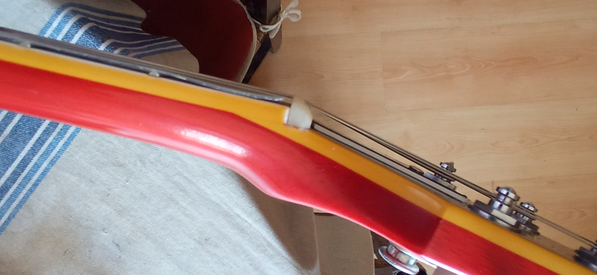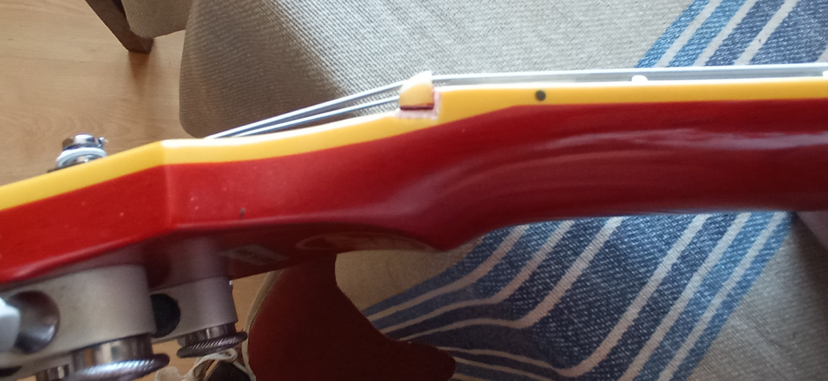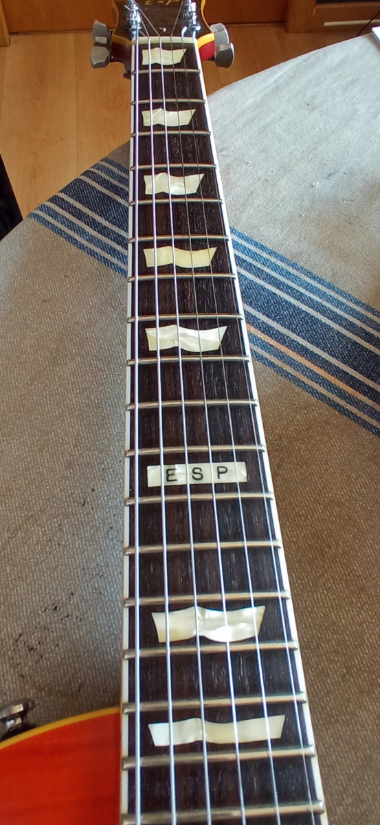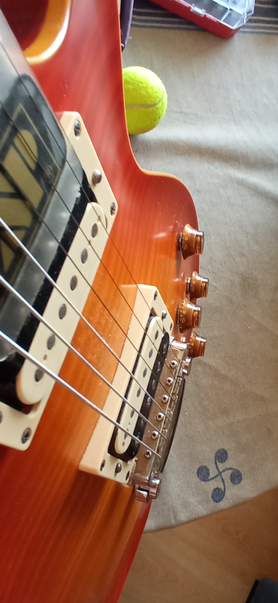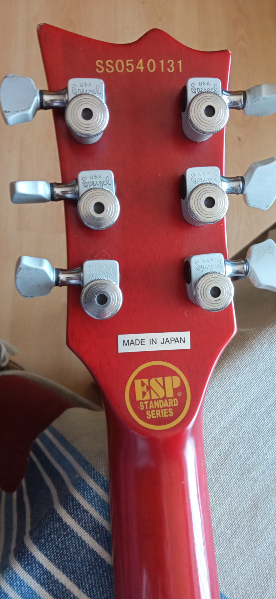 Mastil comodisimo y rápido. Trastes en buen estado y clavijero sperzell de bloqueo. Tiene un par de dings y un salto de pintura en la base del cuerpo que he intentado reflejar en las fotos, que no afecta en absoluto a la estructura de la guitarra.