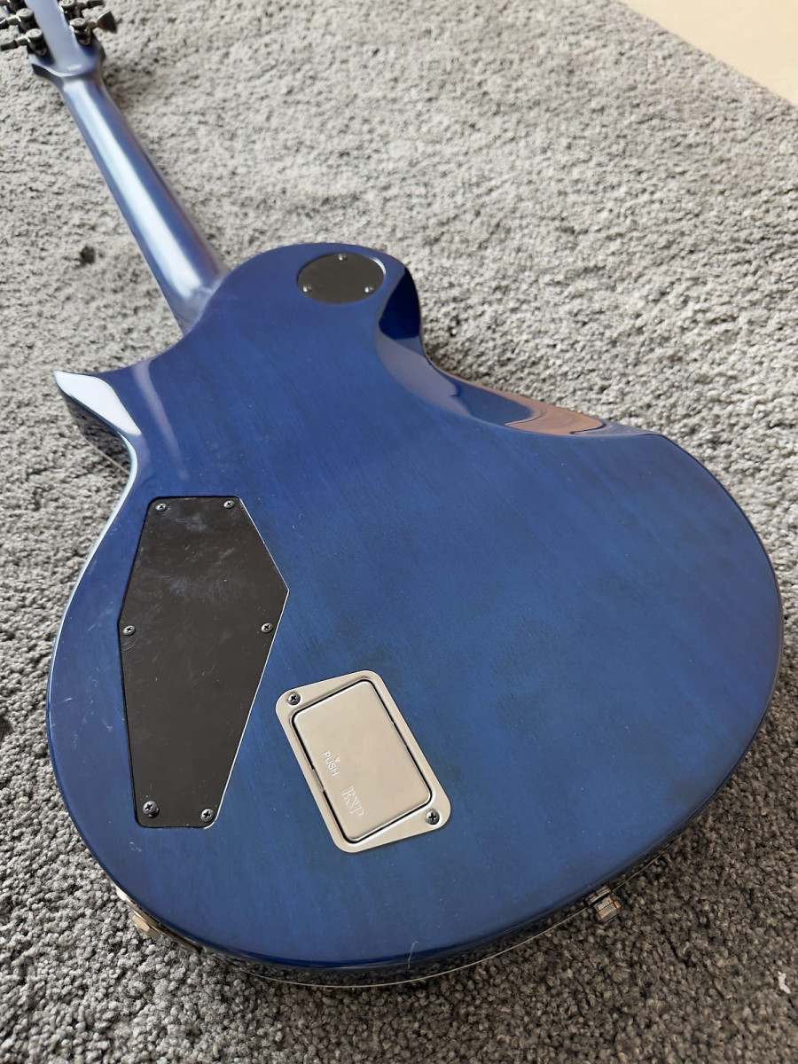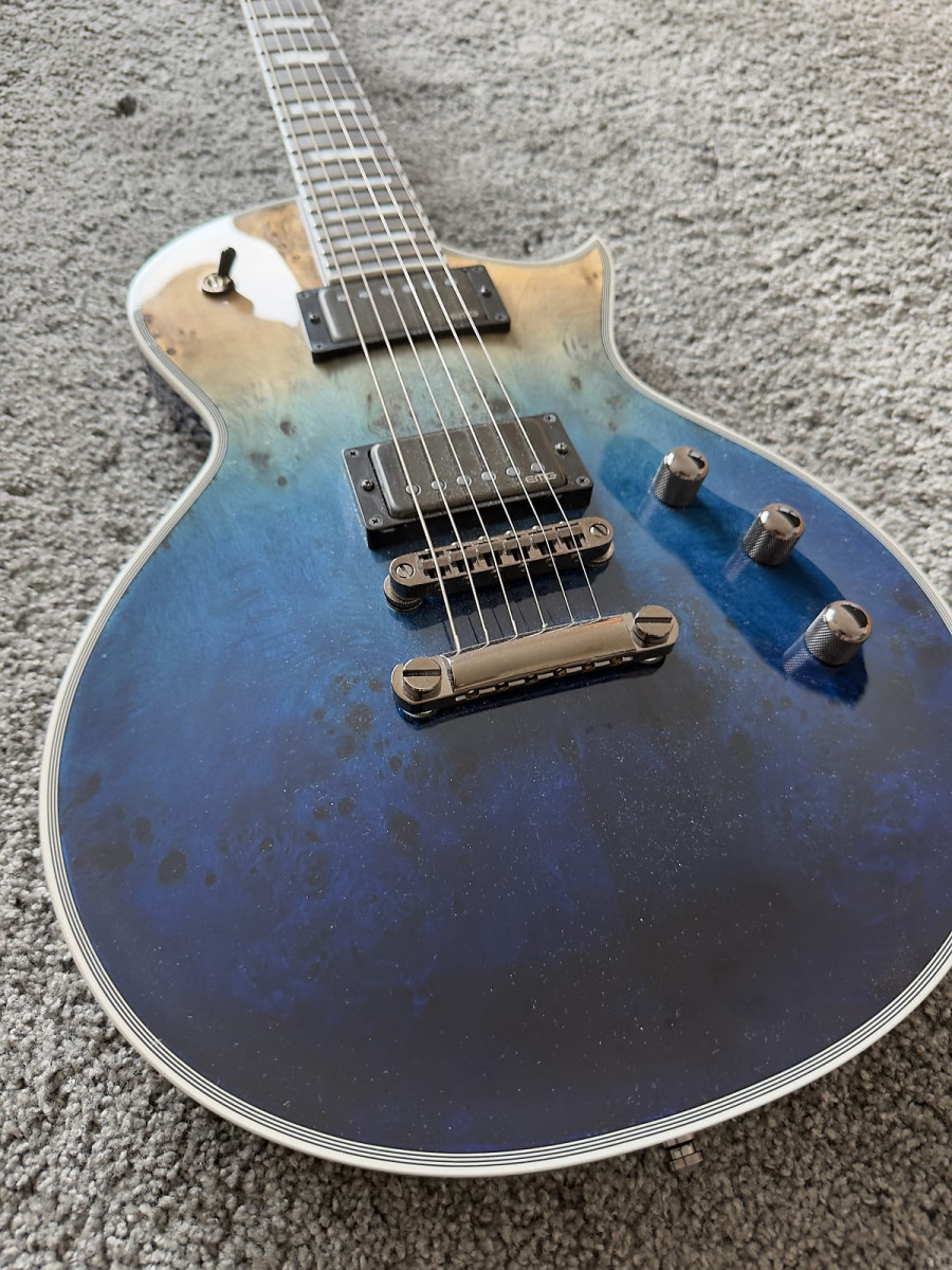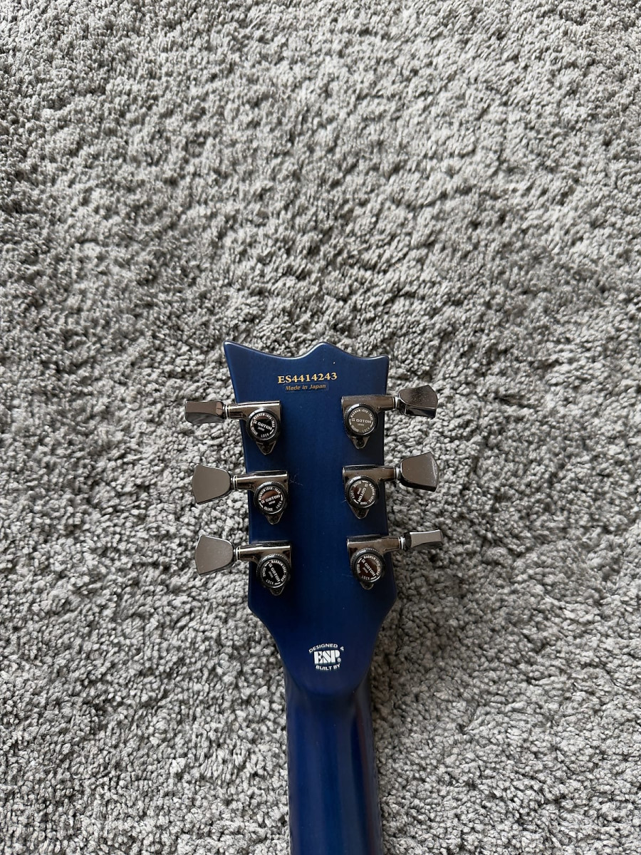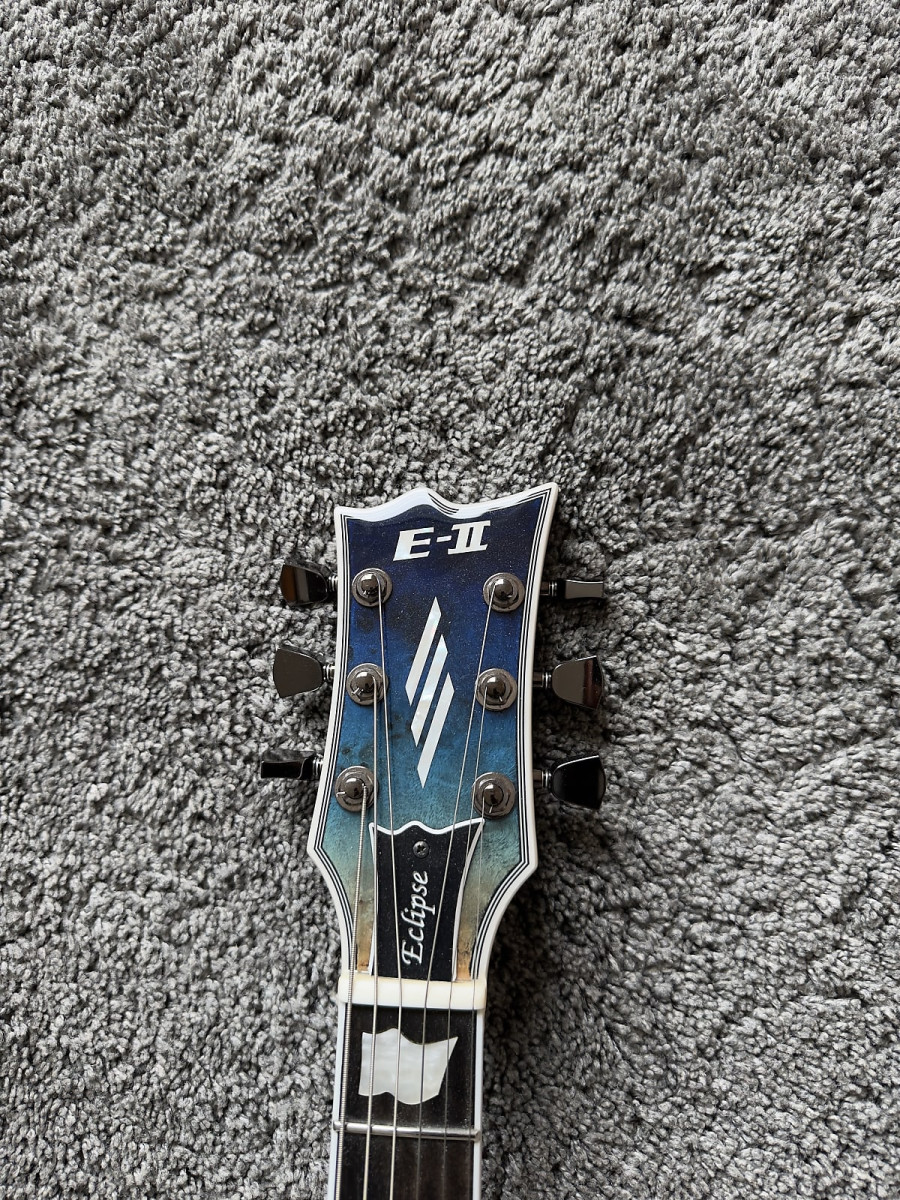 Guitarra eléctrica ESP E-II Eclipse en acabado azul degradado.